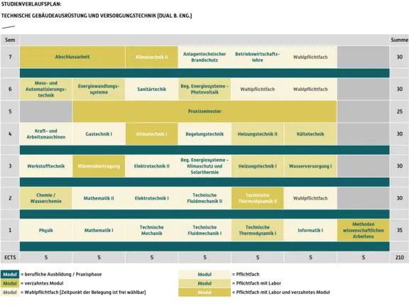 Die Besonderheit dieses dualen Studiums besteht darin, einen qualifizierten Berufsabschluss in einem von vier möglichen Ausbildungsberufen und einen darauf aufbauenden Studienabschluss als Bachelor of Engineering (B.Eng.) Technische Gebäudeausrüstung und Versorgungstechnik innerhalb von viereinhalb Jahren erreichen zu können.