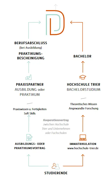 Diese Art des Studierens bietet eine ideale Vorbereitung auf anspruchsvolle Tätigkeiten in mittelständischen Unternehmen. Wenn Sie an einem ausbildungsintegrierten Studium interessiert sind, lassen Sie sich bitte vorab bei der HWK Trier oder IHK Trier beraten.