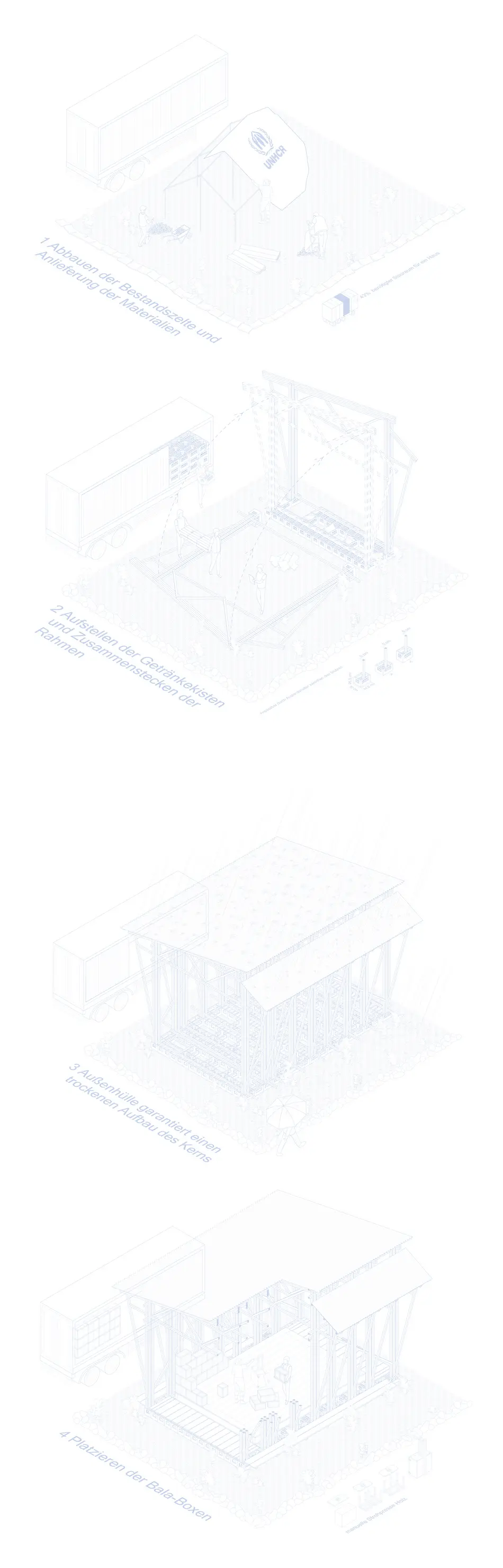 Die Hauptmaterialien sind Holz und Stroh. Stroh als landwirtschaftlich nur teilweise verwendeter Pflanzenteil unterschiedlicher Nahrungspflanzen ist global verfügbar, an fast jedem Standort gut beschaffen und mit einer einjährigen Umtriebszeit rasch nachwachsend. Für den notwendigen trockenen Aufbau des Strohs wird zuerst die Außenhülle aus 6x6 cm Holzprofilen aufgebaut und dann der innere, thermisch isolierte Strohkern. Die kleinen Holzprofile sind handlich und, genau wie die Bretter im Dach der Strohbox, kostengünstigeres Schnittholz. Das Fundamentraster bilden ausrangierte Getränkekästen, die auf einem Kieswall eben ausgelegt werden können. Zur Beschwerung und zur Aufnahme der Feuchtigkeit werden diese mit den vor Ort vorhandenen Sandsäcken gefüllt. Der Zeltboden der Flüchtlingszelte eignet sich als Abdichtungsfolie gegen aufsteigende Feuchtigkeit im Boden. Die verwendeten Cola-Kisten haben relativ kleine Flaschenfächer, die die Stützenprofile aufnehmen. Mithilfe von Abstandshaltern zwischen den Holzprofilen ist eine Anpassung an jede Kastengröße möglich. Die Außenhülle besteht aus einem doppelten, mit einem Wellblech aus gepressten Tetra Paks gedeckte Pultdach, das als eine Art Kaltdach eine gute Belüftung des thermisch getrennten Strohkerns sicherstellt. Das Dach und der Boden des Strohkerns werden mit einfachen Strohballen ausgefacht, während die Außenwand aus Holzständerboxen besteht, in die Stroh gepresst wird. Diese Boxen können gut von einer Person getragen werden. Verlegt und miteinander verschraubt werden sie im Mauerverbund, sodass keine Kreuzfugen entstehen und dennoch immer lastableitende Ständer übereinanderliegen. Das Stroh wird mittels eines einfachen Werkzeugs, einer Box aus Siebträgerplatten gepresst, an deren Hebel man die Druckplatte austauscht, sodass sie entweder zwei halbe, eine ganze Holzständerbox oder einen Ballen pressen kann. Außen und innen wird die Strohbox mit Strohbauplatten im Nut und Feder-System verkleidet. Auch die Möbel werden aus Lignin-gebundenen und daher kompostierbaren Strohplatten gefertigt. Die Bauteilfugen an Fenstern und Türen werden mit Flachs ausgestopft. Im Sanitär- und Küchenbereich sind Platten aus gepresstem Plastikmüll verbaut, um die Strohbauplatten vor Feuchtigkeit zu schützen. Als Schlagregenschutz wird die Außenhülle gebrauchter Flüchtlingszelte verwendet, die an den Eingängen mit einer Art Flaschenzug aufziehbar ist. Für diesen konnten die Ösen, Seile und Stangen der alten Zelte verwendet werden. Die Batterien der PV-Anlage sind im Dachraum untergebracht und versorgen das Haus mit 3,2 kWh und einem Speicher von etwa 3,84 kWh. Durch die Komposttoilette fällt kein Schwarzwasser an, und eine 4.000-Liter-Zisterne versorgt Dusche sowie Waschbecken mit aufbereitetem Regenwasser.