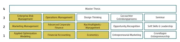 Der Studiengang ist als 4-semestriger Vollzeitstudiengang konzipiert und modular aufgebaut, kann aber auch berufsbegleitend absolviert werden, wenn dies vom Arbeitgeber unterstützt wird. Das Curriculum besteht aus den drei Blöcken Management, Entrepreneurship und der Abschlussarbeit, in der die konkrete Unternehmensgründung vorangetrieben werden kann.