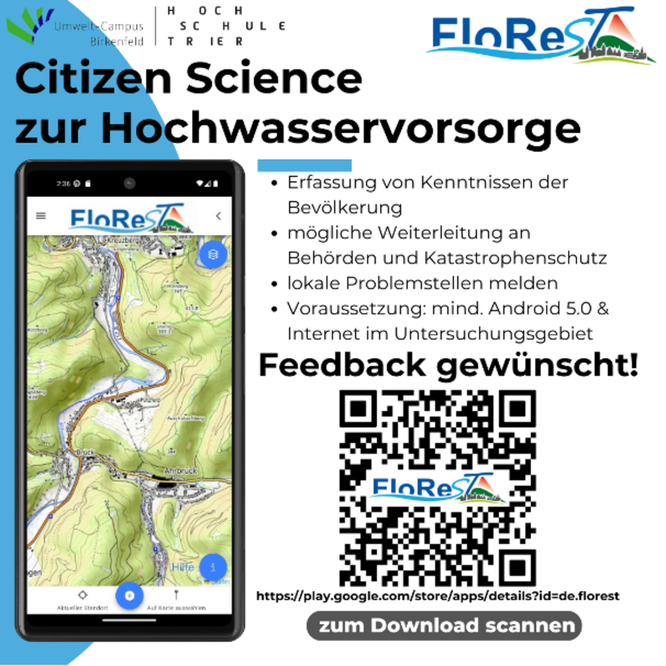 Im Rahmen des Projektes FloReST wurde eine Smart-App zum Melden von Problemstellen bei Starkregen entwickelt, die das Wissen von Bürger*innen den Behörden und Forschungseinrichtungen zugänglich machen soll.