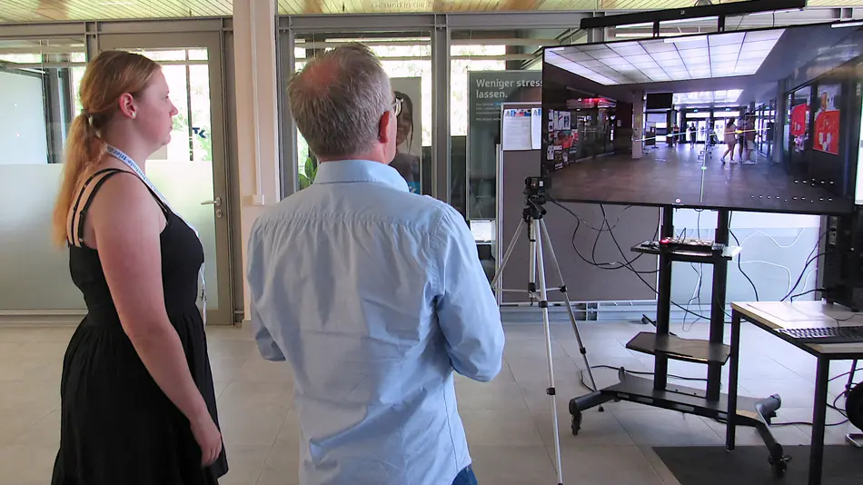 Aus den insgesamt acht interdisziplinären Anwendungsfeldern wurden sowohl Exponate im Foyer der Mensa als auch an drei weiteren Stationen gezeigt. Hohe Aufmerksamkeit erzeugte die Verkehrszählung mit KI (Prof. Dr. Roland Trapp), dargestellt durch eine sichtbare Erfassung des Besucherstroms auf einem großen Monitor.