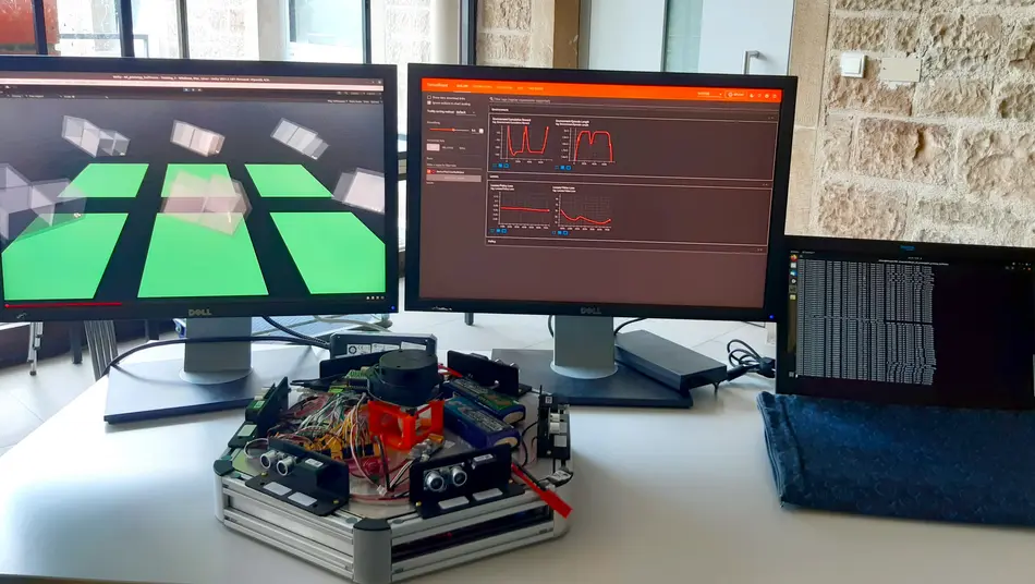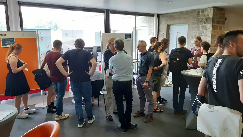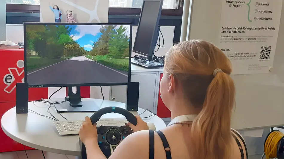 Die Aufmerksamkeit der Studierenden wurde anschließend zu weiteren Demonstratoren gelenkt, wie der hochfrequentierten Fahrt mit dem statischen Fahrsimulator (Prof. Dr. Jörn Schneider) und der Erfassung von Augenbewegungen anhand von Muskelströmen (Prof. Dr. Klaus Peter Koch). Außerdem wurden ein mobiler Roboter (Prof. Dr. Matthias Scherer), die Methodik von künstlichen puls-codierten neuronalen Netzen (Prof. Dr. Elmar Seidenberg) und der Reinforcement Learning Contest (Prof. Dr. Ernst Georg Haffner) vorgestellt.