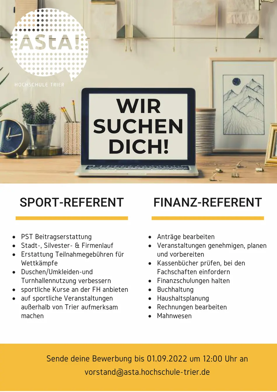 Der AStA sucht neue Mitglieder im Bereich Finanzen & Sport zum Wintersemester 2022/23.