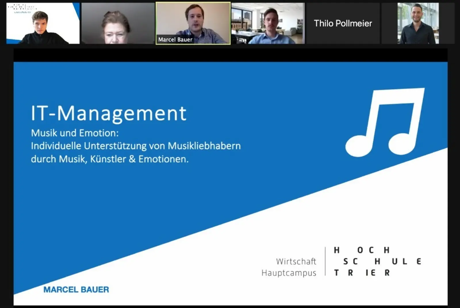 Um diesem Dilemma zu begegnen wurde von Frau Prof. Dr. Kuhn im Rahmen der Lehrveranstaltung „IT-Management“ den teilnehmenden Masterstudierende des Fachbereichs Wirtschaft und Informatik der Hochschule Trier das Thema Unterstützung von Kulturschaffenden mit Hilfe von IT zur Bearbeitung vorgelegt. Am 19.01.2021 wurden die Ergebnisse einem Publikum aus der Kulturbranche vorgestellt. Aufgrund der mit der Corona-Pandemie verbundenen Schwierigkeiten war es naturgemäß den Studierenden ein großes Anliegen die Branche der Kulturschaffenden zu unterstützen und brauchbare IT-basierte Systemlösungen zu präsentieren. Der Schwerpunkt jedes Studierenden lag in unterschiedlichsten Bereichen, sodass unter dem verbindenden Slogan “Wir schaffen Kultur”, von dem Masterstudenten Fabian Roth erfunden, IT-Unterstützungen von der Vernetzung zwischen Kulturschaffenden, Kulturvermarktung, Kulturinteressierten der Thematiken Generierung von Fördermitteln über den gezielten Einsatz von sozialen Medien bis hin zur Serviceunterstützung der Kunstschaffenden selbst abgedeckt wurde. Die Präsentation erfolgte - pandemiegetrieben - in diesem Jahr über ZOOM und löste interessante Diskussionen bei den anwesenden Gästen aus.