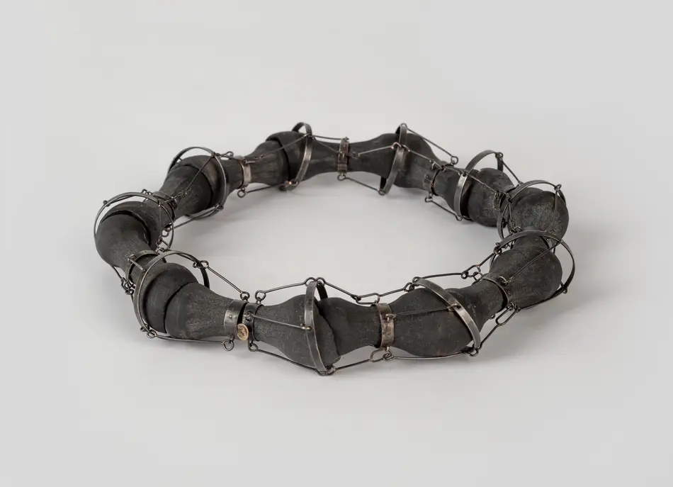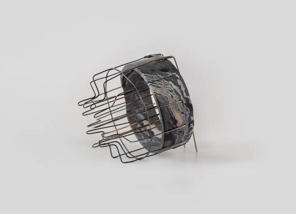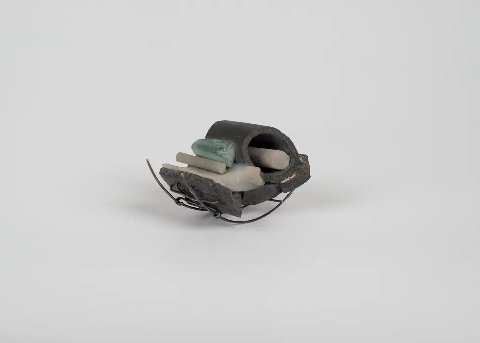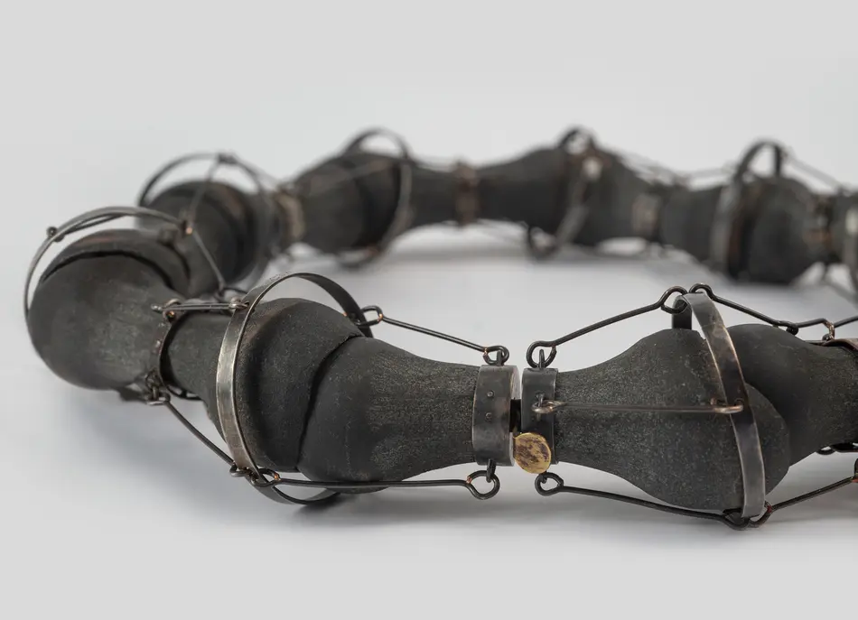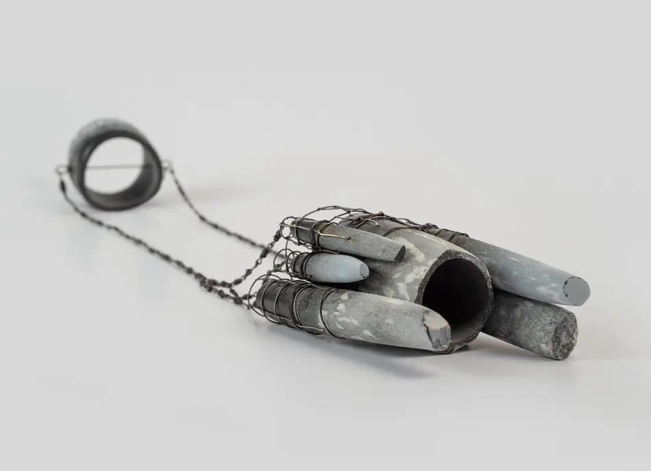 This research concludes with a series of jewellery pieces which attempts an act of human objectification, allowing body parts, or at least in this case, the reminiscence of them, to tell the story of a specific kind of violence that is transgressing human limits. The great advantage of embodying human memories is the transparency or rawness that is inherent in their symbols. Repeatedly breaking, abrading, and reconstructing enduring stone. Like this, the passage of time is recorded. The fragility of metal is put to the maximum test, vulnerabilities that, all together, sustain with ample strength. This research is a claim for recognition. Reflecting on the portrait of war that political art offers, which can reveal the mirror of memory to discover a national identity."