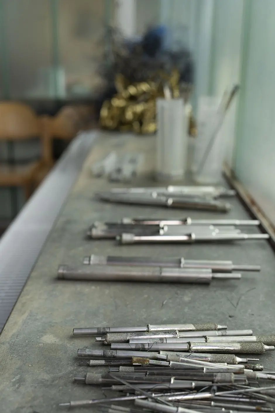 For many years the production of diamond tools has revolutionised industrial processes ranging from the automotive industry to the gem trade. Lab grown diamond powders used for faceting, for example, attract higher prices than the natural material. However, until today the techniques used to produce these tools have not been widely applied as creative techniques and its waste remains stored in small and large diamond tooling companies. Furthermore, the use of lab grown diamonds (or ‘synthetics’ as they are called in the industry) remains a highly contested subject in the jewellery field.