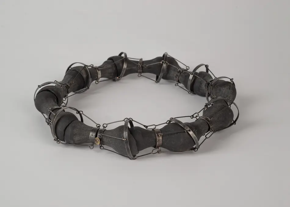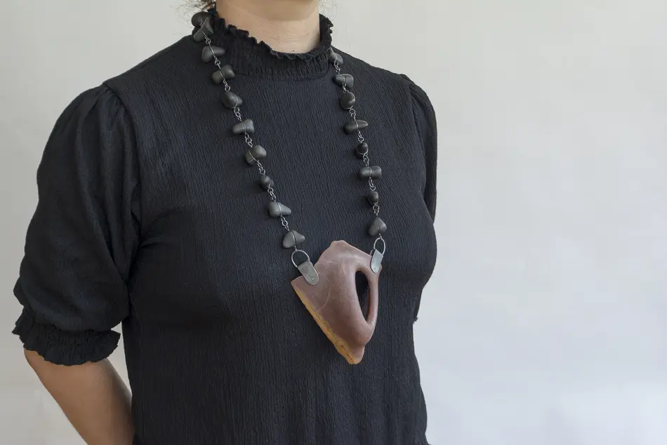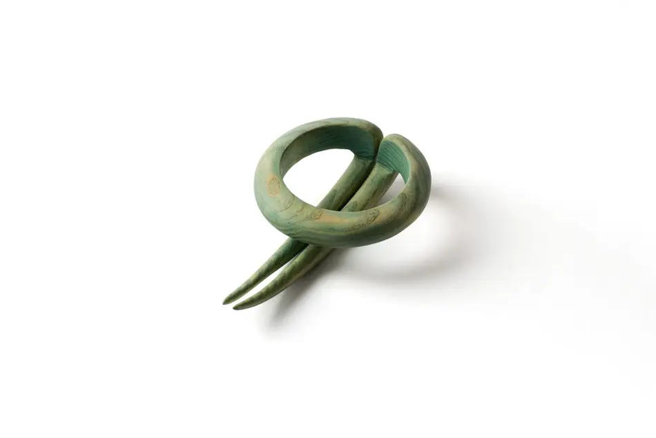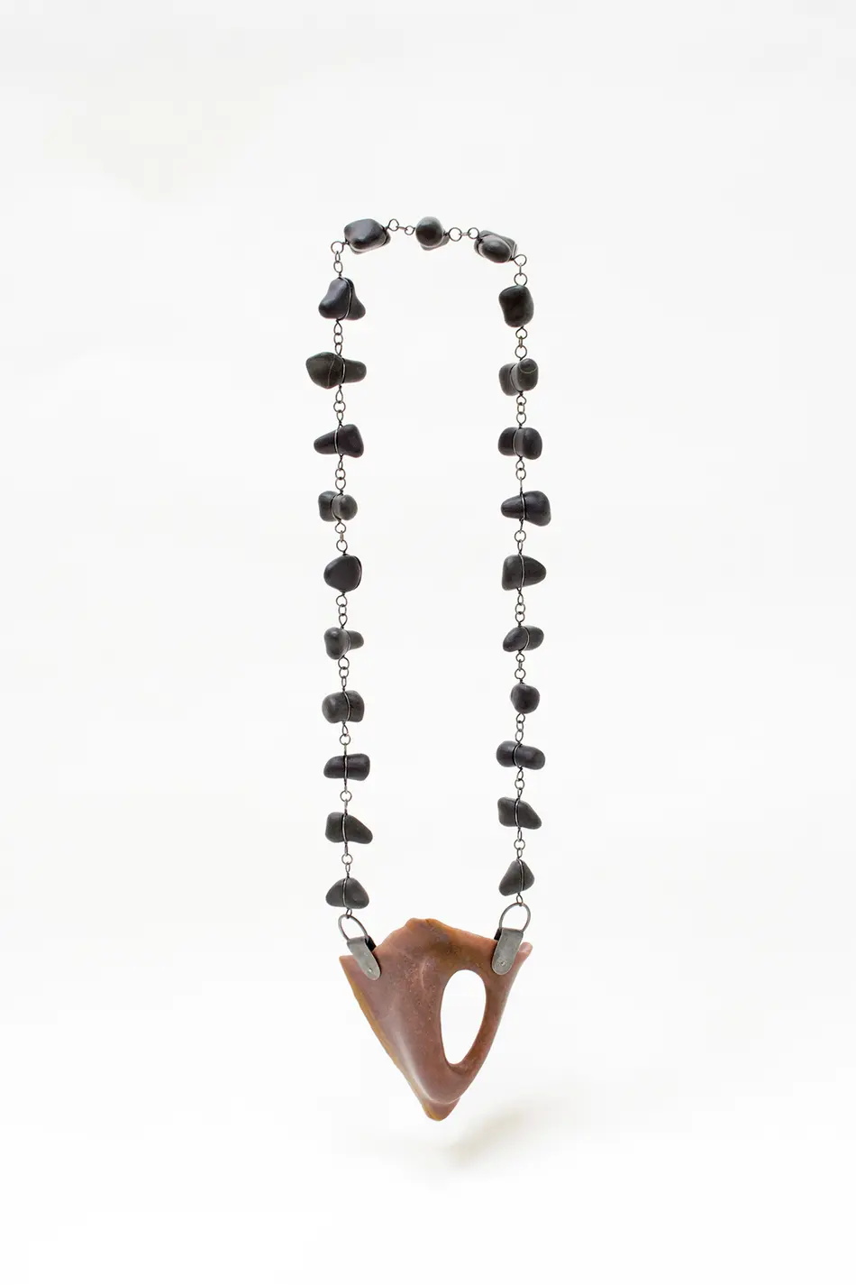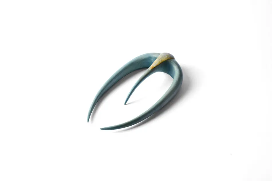 Looking at society, I consider the role of the jewellery artist the one of an angler, the one who looks for special ways, motifs and actions to tempt, lure and who finally catches “the big fish” (customer). The jewellery, “the bait”, is created with the hope for a successful catches and in order “to snag the prey”. To provoke a smart fish to bite the sharp hook, the bait itself has to have the appropriate seductive power. Therefore, and in order to provoke a strong attraction to the observer of my works, I have aimed to emphasize on the notion of curiosity. Each of my pieces represents a small situation, which may recall stories to the viewers, still leaving them space to discover their own. I create my works from different materials and shapes, even with smooth surfaces, so that people want to touch and feel them. Their shapes speak for themselves, which makes the observers become meditative and let their own emotions and fantasies to unfold. Last but not least, each work invites to a metaphorical reflection.