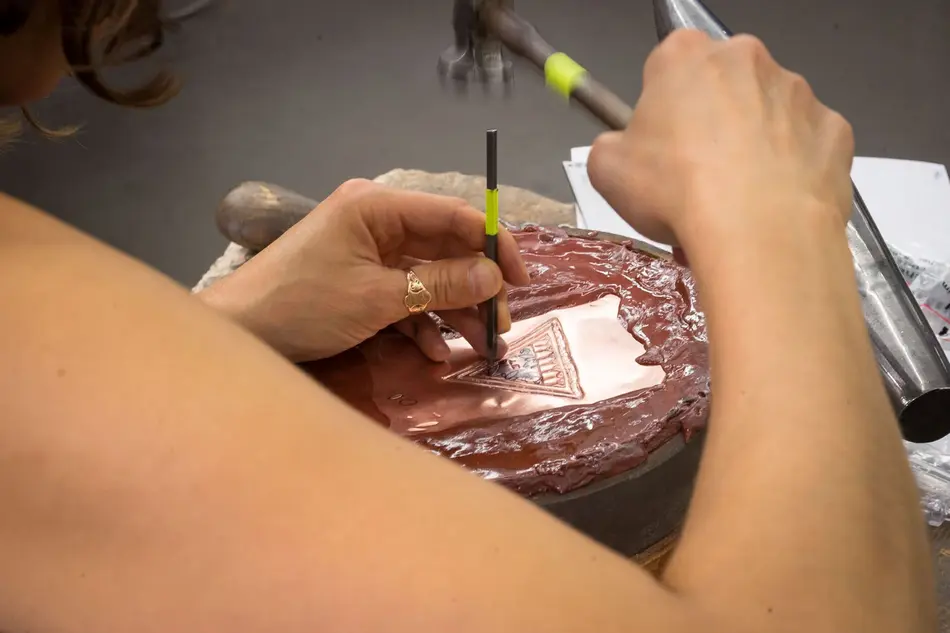 The participants explore how to use the tools for chasing and repoussé, which are basically limited to a few things: A chasing hammer, the pitch and the punches, of which admittedly there are many (and some of them you may have made yourself) . An understanding of modeling and ‚moving‘ the metal will be trained as well as the transformation of an idea, an image into the three dimensional. A great increase in metalworking skills!