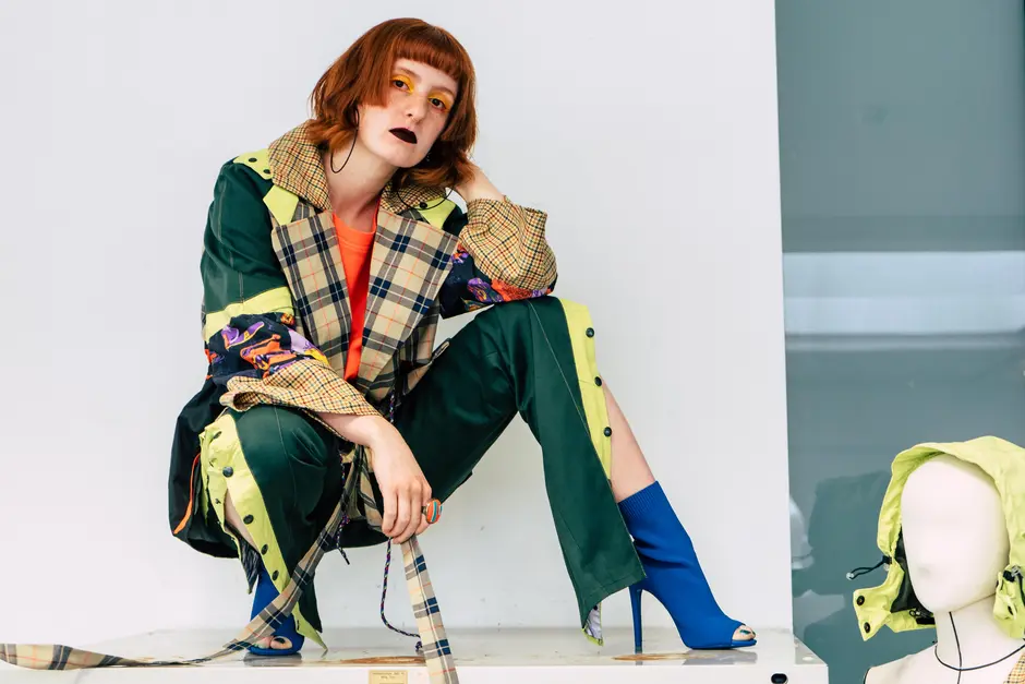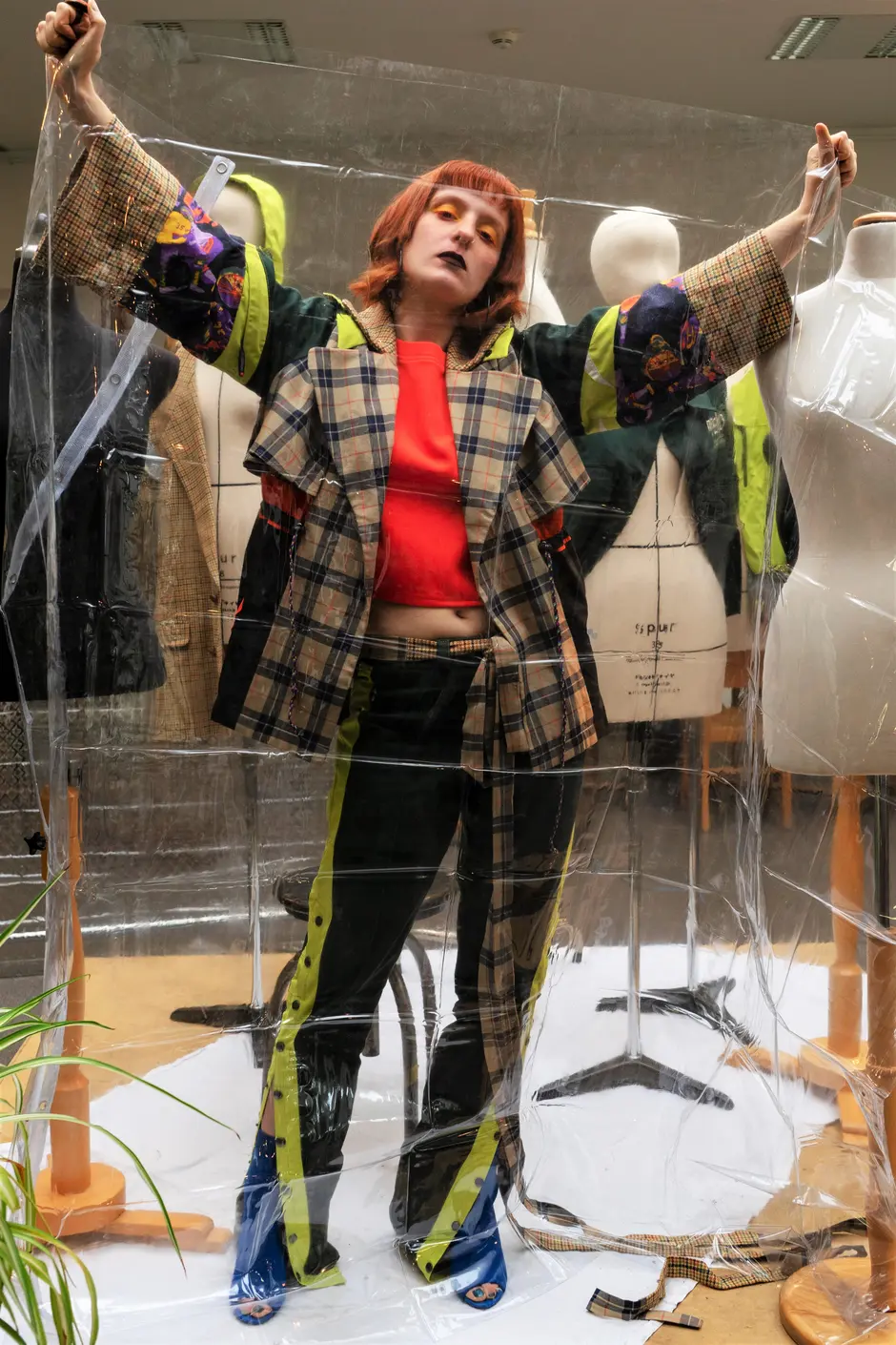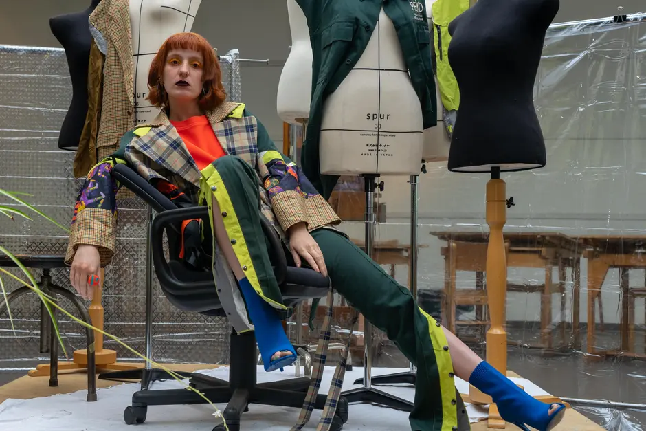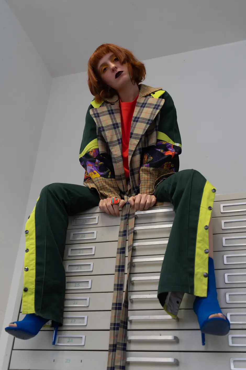 The set contains sporty as well as classic elements and was created from a rain jacket from the 80s, a lime-green ski jacket, a large work overall and a checked jacket.