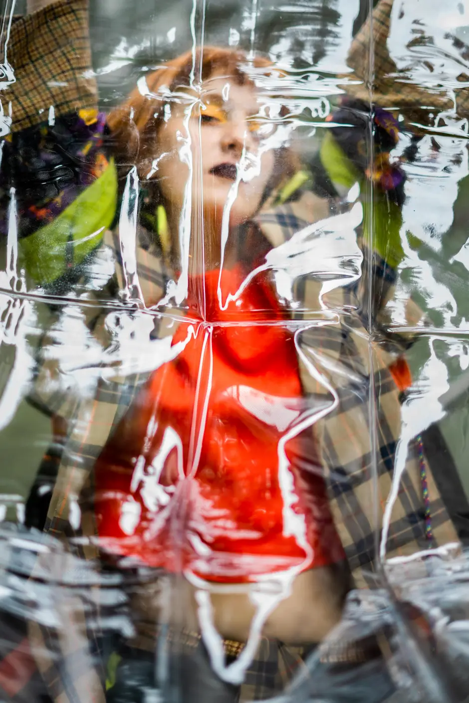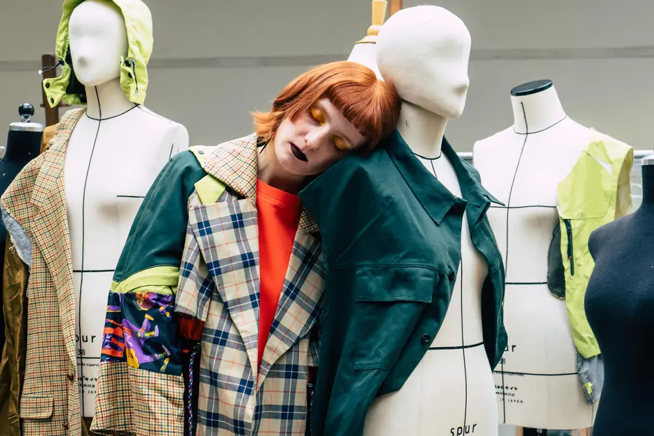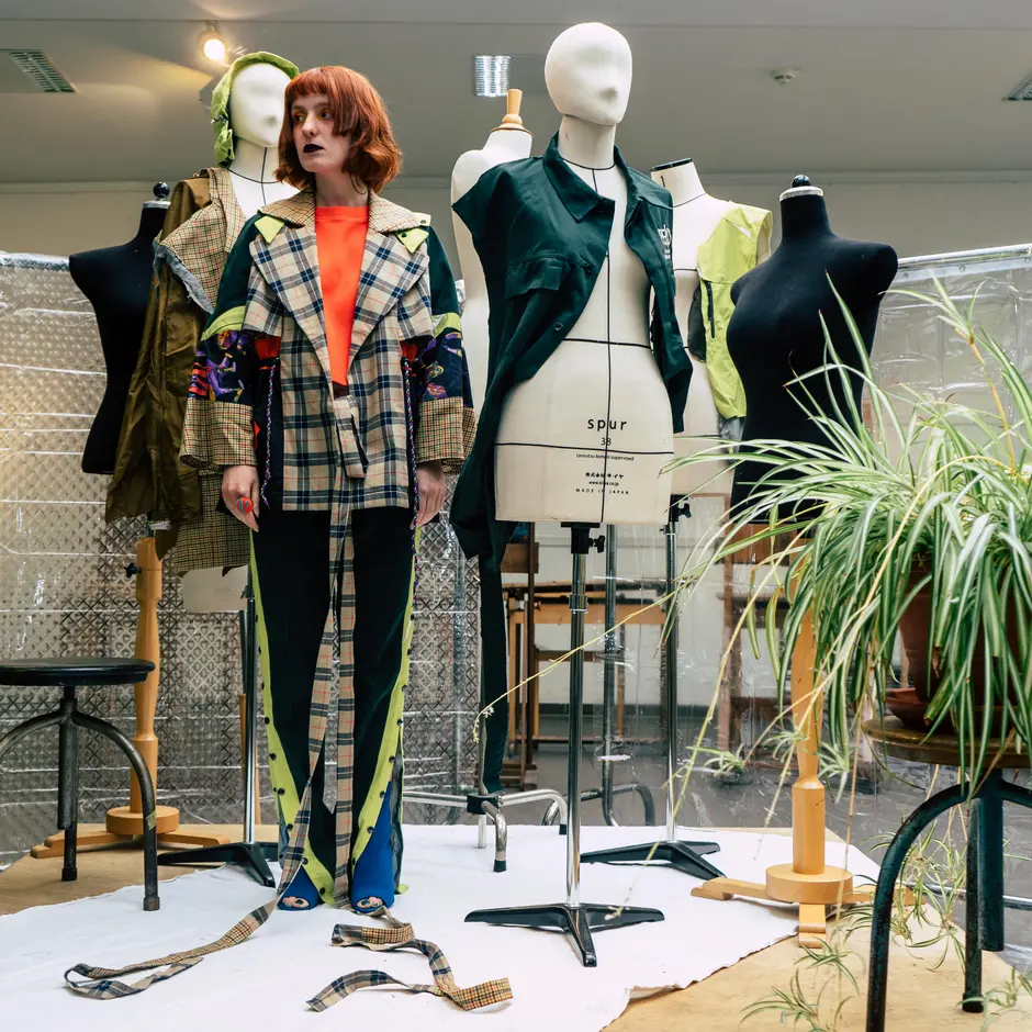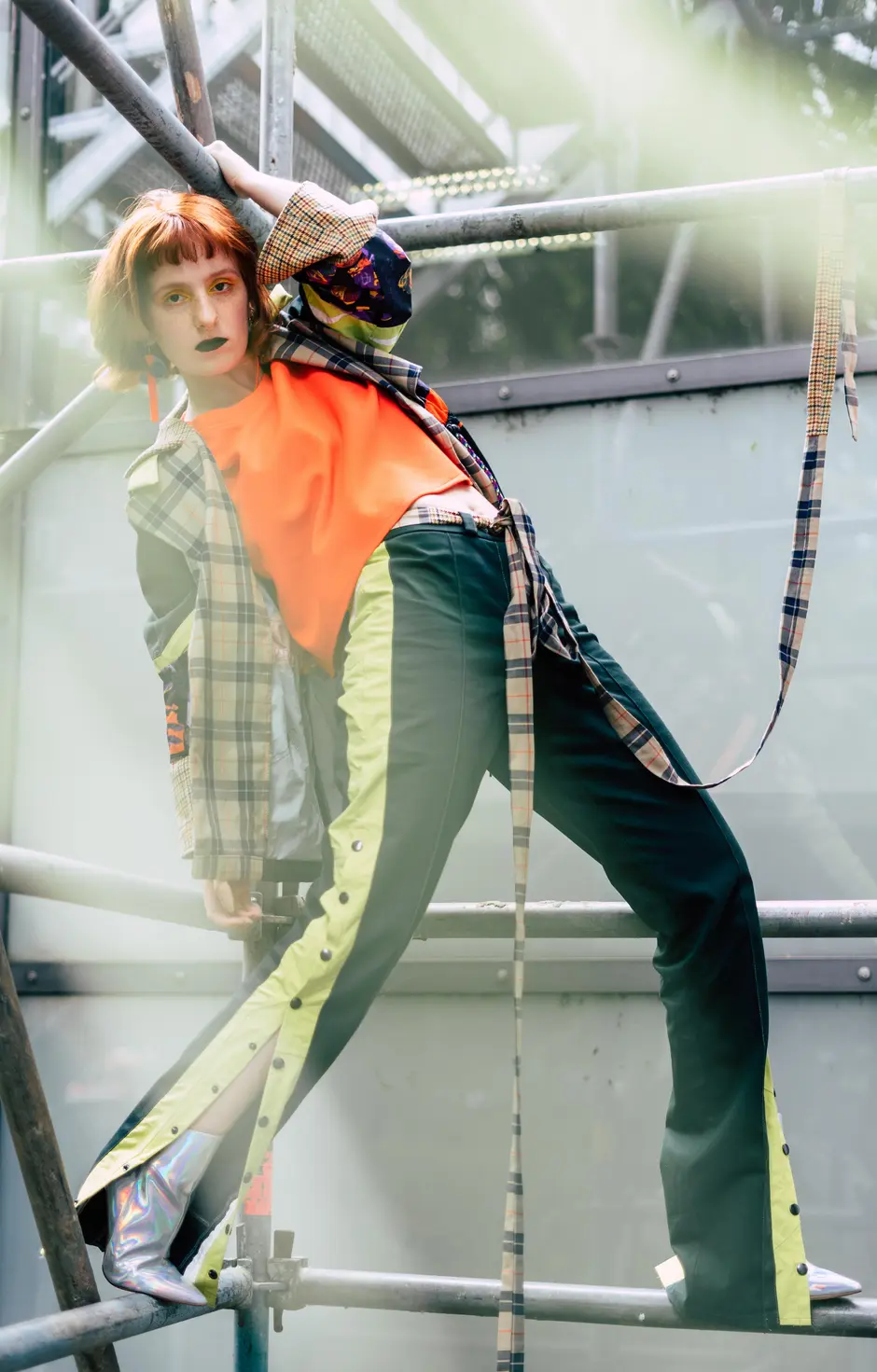 The set contains sporty as well as classic elements and was created from a rain jacket from the 80s, a lime-green ski jacket, a large work overall and a checked jacket.