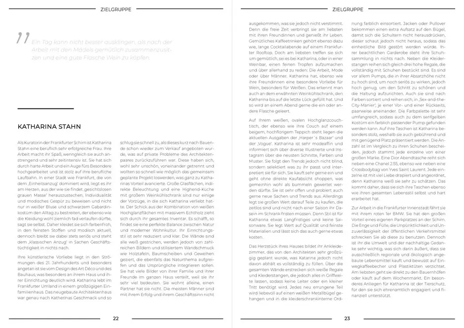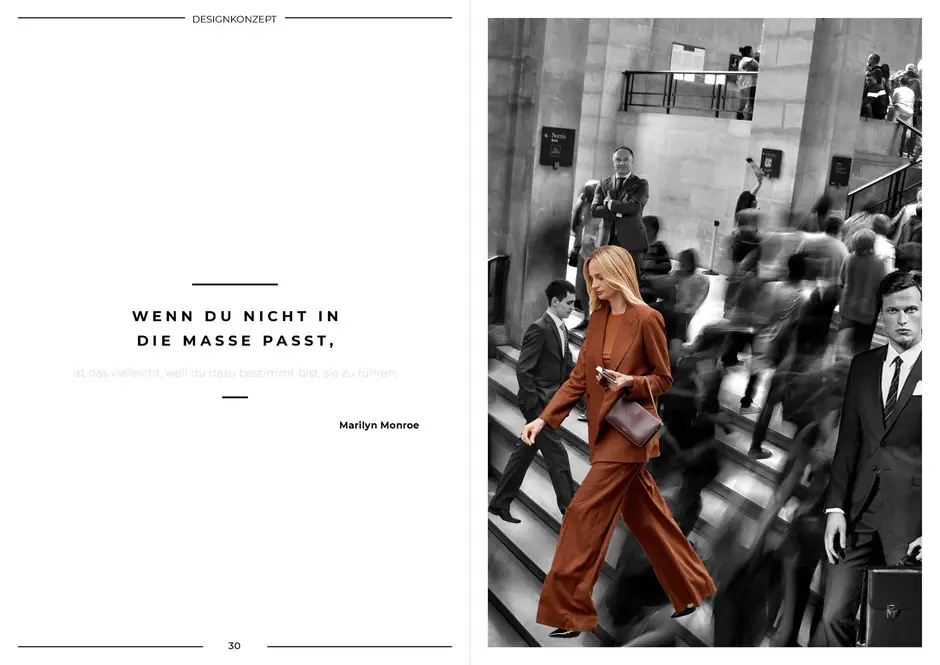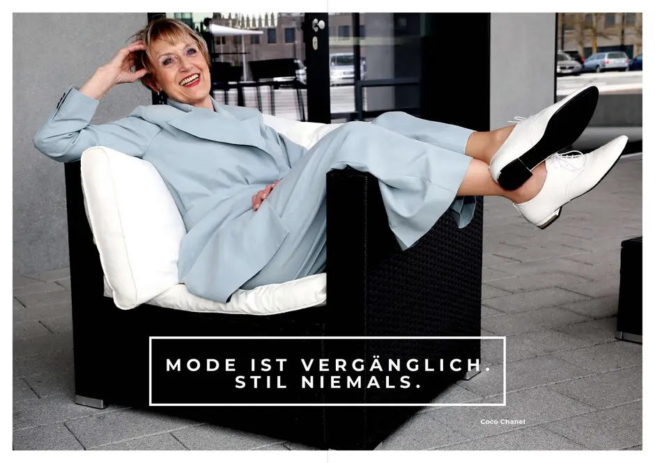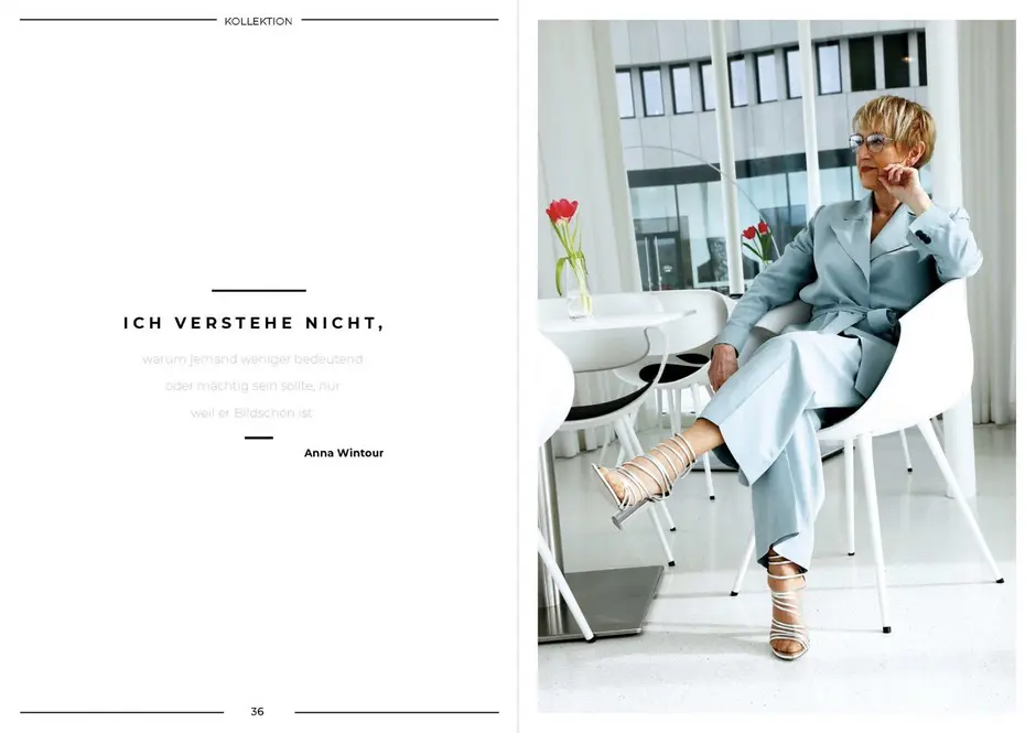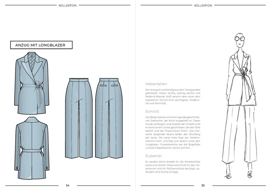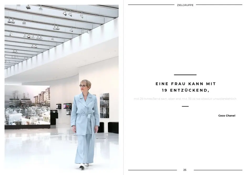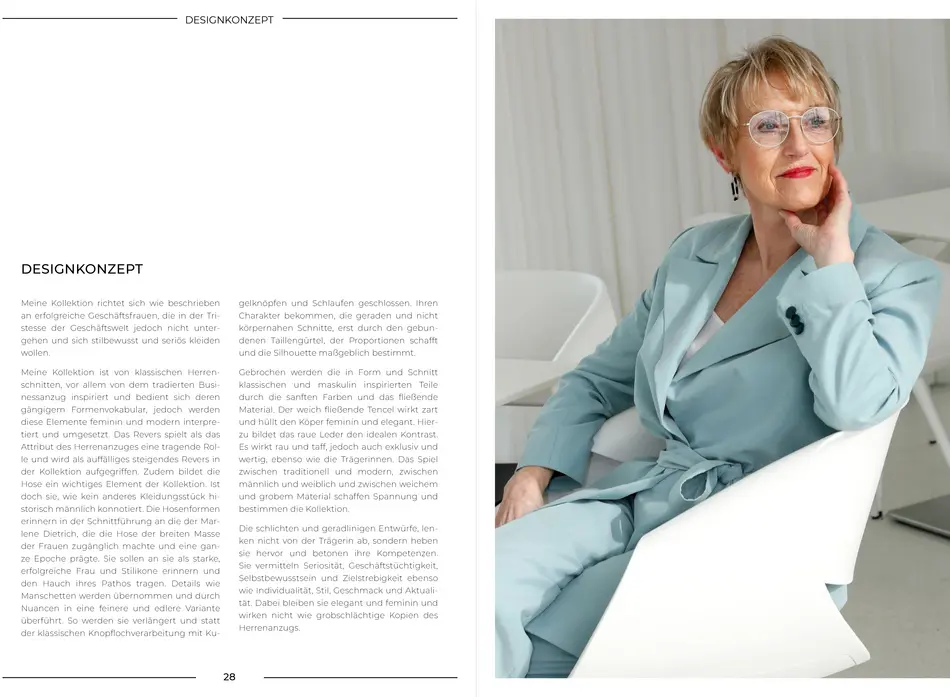 The simple and straightforward designs, do not distract from the wearer, but highlight her and emphasize her skills. They convey seriousness, business acumen, self-confidence and purposefulness as well as individuality, style, taste and topicality. At the same time, they remain elegant and feminine and do not look like crude copies of the men's suit.