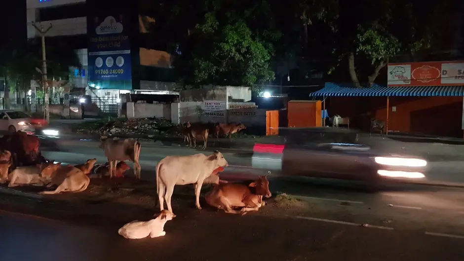 A two-lane road in India, the dilapidated asphalt is littered with potholes. A group of cows relaxes in the middle of the lane. All around, bustle. Seemingly without structure, a large number of honking scooters and motorcycles, tuk-tuks, cars and colorful trucks wind their way through the city.
