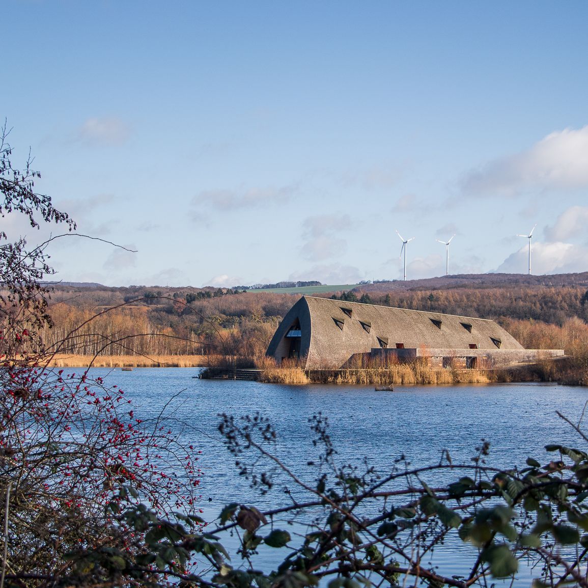 The Biodiversum is located in Remerschen, Luxembourg. It is very close to the Haff Reimech Nature Reserve. The visitor center building is quite special from its design and purpose. It has very low impact on the surrounding landscape and is purposely integrated into the cradle to cradle approach. The energy source emphasizes eco-friendly technologies and sustainability. The inside of the building exhibits taxidermied birds for information and topics related to environment awareness. The location is preferable for short walks and also surrounded by lakes for summer swims.