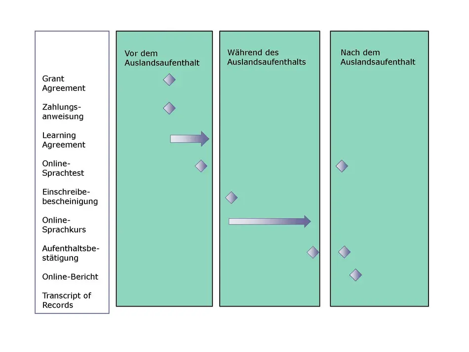 Nach dem OK des Fachbereichs bitte mit den weitgehend ausgefüllten Formularen "Grant Agreement" und "Zahlungsanweisung" (siehe Erasmus Formulare) zum International Office kommen, dort werden die weiteren Einzelheiten geklärt und die Kandidaten bei der Partnerhochschule nominiert. In den meisten Fällen können Studienleistungen, die im Ausland erbracht werden, auf das Studium an der Hochschule Trier angerechnet werden. Dies sollte man vorab unbedingt mit dem Auslandsbeauftragten im Studiengang oder dem Vorsitzenden des Prüfungsausschusses klären. Dafür vorgesehen ist das Formular "Learning Agreement", das auch für die Gewährung des Erasmus-Stipendiums notwendig ist. Dieses muss von Ihrem zuständigen Professor/Professorin unterzeichnet werden, dann auch vom Verantwortlichen an der Partnerhochschule und ist verpflichtend für die Erasmus-Förderung.
