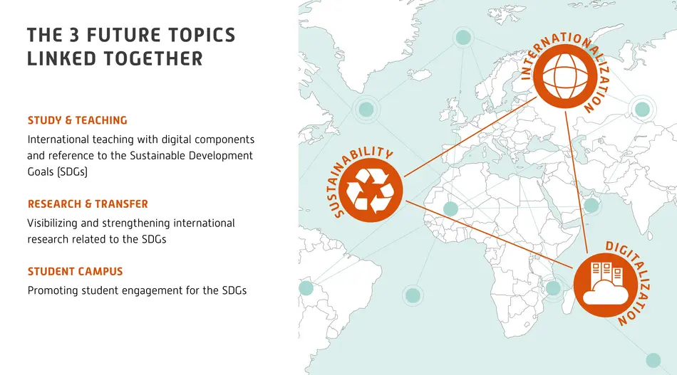 In the project "Hochschule Trier International: Global Innovation for Sustainable Futures", which will be funded between 2022 and 2025 with a funding volume of almost 1 million euros, Trier University of Applied Sciences is linking the three future topics of internationalisation, digitalisation, and sustainability.