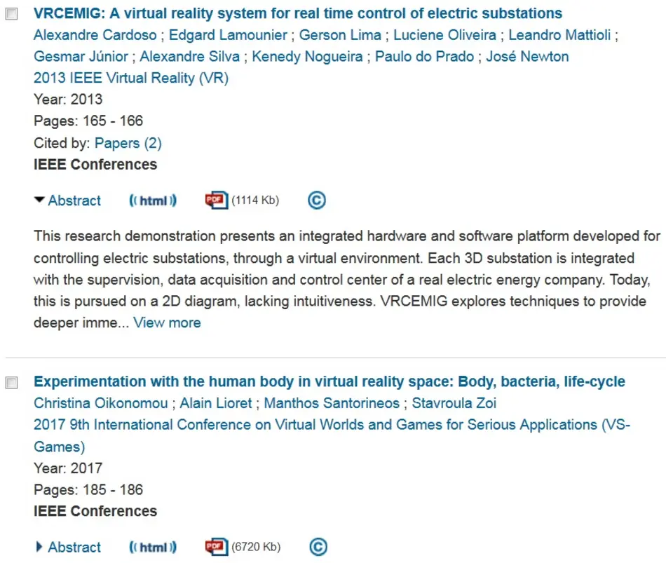 The first one shows a part of a hit list in the IEEE Xplore Digital Library. For the first entry, the beginning of the abstract was unfolded. Via "view more" the whole summary could be displayed.