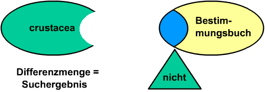 | Meaning | The hit list contains those documents in whose bibliographic description the term "crustacea" appears; those documents whose bibliographic description contains the term "Bestimmungsbuch" are sorted out. |