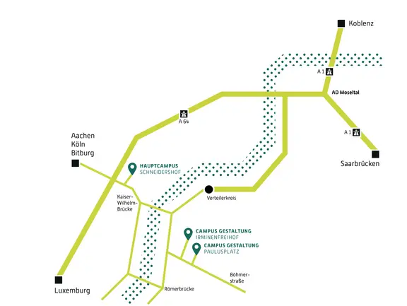 From Trier main railway station, there are regular buses which leave from the station forecourt and go directly to to our main campus. The current timetables can be found at www.vrt-info.de. The relevant bus stops are "Hauptbahnhof, Trier" and "Hochschule, Pallien (Trier)".