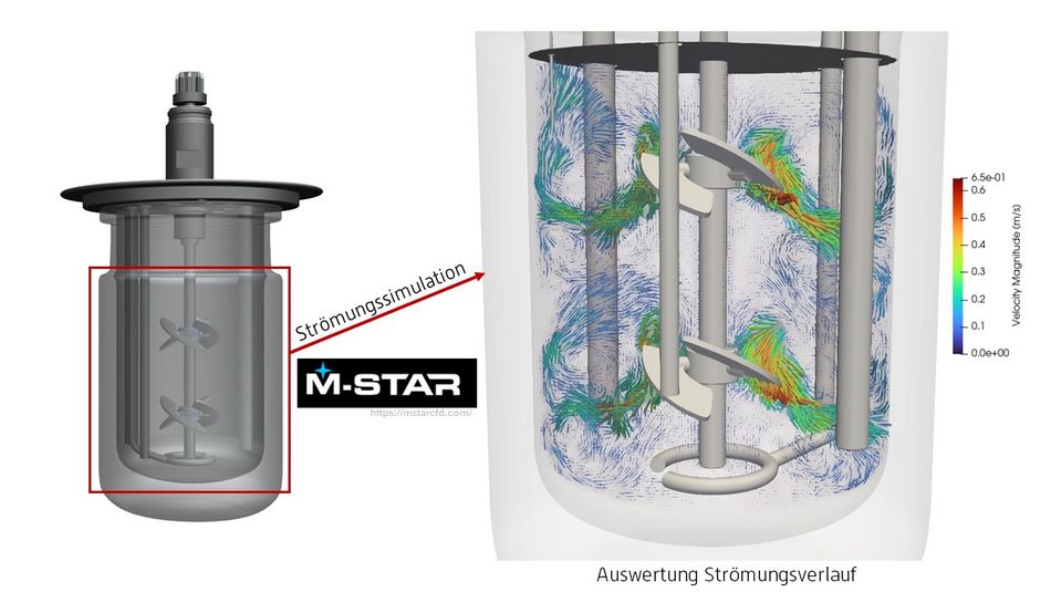 In a first step I digitalized the conventional used bioreactor and exported him into a software for fluid simulation. This software allows the evaluation of shear stresses and mixing times of substances in fluid. I use this mixing time evaluations for the comparison with real mixing time experiments and as a consequence for the validation of software. The simulation of the actual state allows me to identify potentials for optimization inside the reactor. In specific, the aim is to investigate the effects of particular geometric changes and to apply these in an iterative optimization process for an improved reactor configuration. After designing new components , these can then be additively manufactured from plastic or metal, depending on the application. In addition to the iterative optimization work, material studies are also carried out to examine the various 3D-printing processes and available material options in terms of their suitability for use in bioprocess-engineering. These include testings for material strength or tightness.