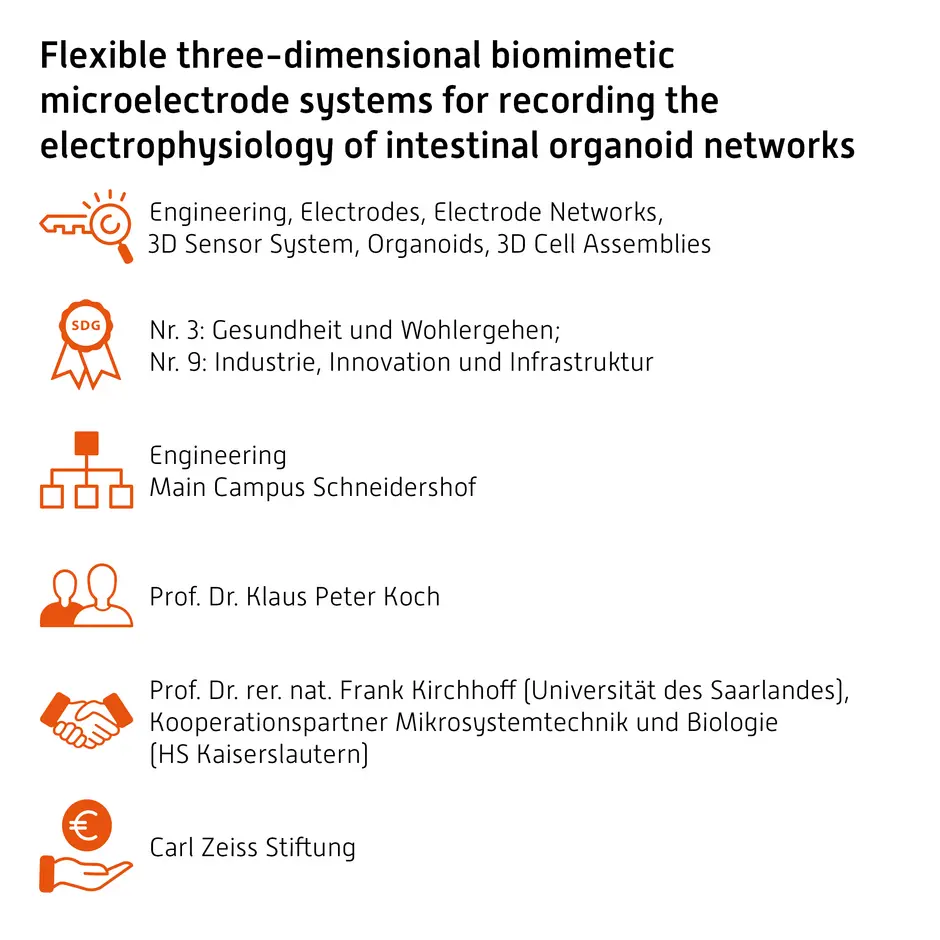 The PhD therefore aims to develop methods to study the physiological processes in three-dimensional cell assemblies that serve as in vitro models of the intestinal wall. To this end, novel microelectrode sensor systems are being developed that are capable of wrapping around or being enclosed by the cells, thus enabling direct interaction with the cells. The integration of microcapillaries into these electrode systems enables the targeted application of test substances to the artificial intestinal mucosa and the monitoring of the quality of the intestinal barrier. To optimize the design of the electrode network, test stands are being developed that can precisely determine the mechanical properties of the intestinal organoids without influencing the physiology during handling, for example their maximum load-bearing capacity. The investigation of the biomechanical interaction between tissue and electrode as well as the causes of electromechanical-induced artifacts are being researched in order to maximize the quality of the derived signals from intestinal organoids with peristalsis. Furthermore, test stations for electrode characterization regarding impedance spectroscopy, electroplating, electric field distribution and their microphonics are developed. The analysis of the construction material polyimide (PI 2610, PI 2611) focuses on biocompatibility and mechanical properties in order to ensure the reliability and functionality of the networks in biological processes. Based on these findings, the models, electrode networks and intestinal organoids are evaluated using the finite element method (FEM) in order to optimize their electrical, mechanical and biological interaction. Once developed, the electrode network will be used in an in-vitro test environment to record three-dimensional electrophysiological signals. These findings may contribute to the development of new diagnostic and therapeutic strategies.