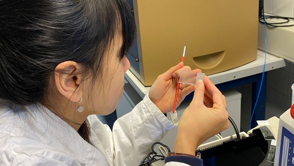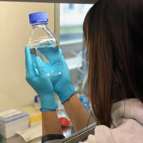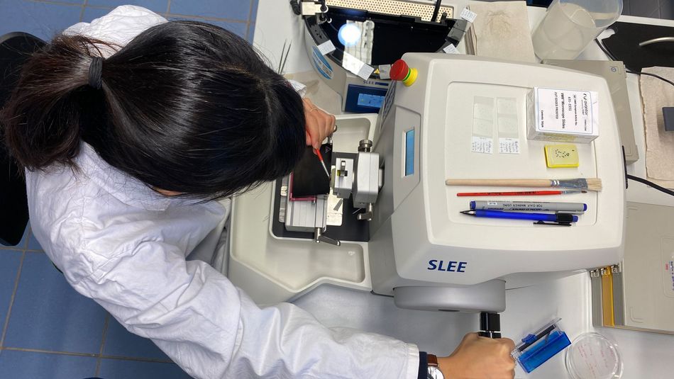 I normally start the bioreactor fermentation on Friday. The fungi need up to 48 h to go through their lag phase until they form pellets. Therefore, I can enjoy the weekend without the need to take samples. As soon as the pellets are formed, I will take samples every 8 hour a day. After the fermentation is finished, the fungal biomass will be harvested. The extraction process will take place until the extract of protease inhibitor is obtained. In order to prove the production of protease inhibitor in every fermentation, an assay is performed by reacting the protease inhibitor against rhodesain enzyme. If protease inhibitor is produced, the rhodesain will be inhibited and no product can be detected from the reaction; on the other hand, if the inhibitor activity is low, the rhodesain can still react with the substrate and produce a fluorescence substance as product. The production of protease inhibitor is presumably influenced by the fungal pellet morphology. Thus, the pellet morphology is also investigated in my study. The pellets are in Paraffin embedded and then 20 µm thin-sliced using Microtome. The internal structure of the pellets is observed using microscope.