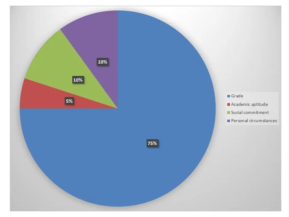 Applications are assessed on the basis of a fixed list of criteria. Of the points awarded, 75 percent are allocated to the grade, 5 percent to academic aptitude, 10 percent to social commitment and 10 percent to the applicant's personal circumstances.