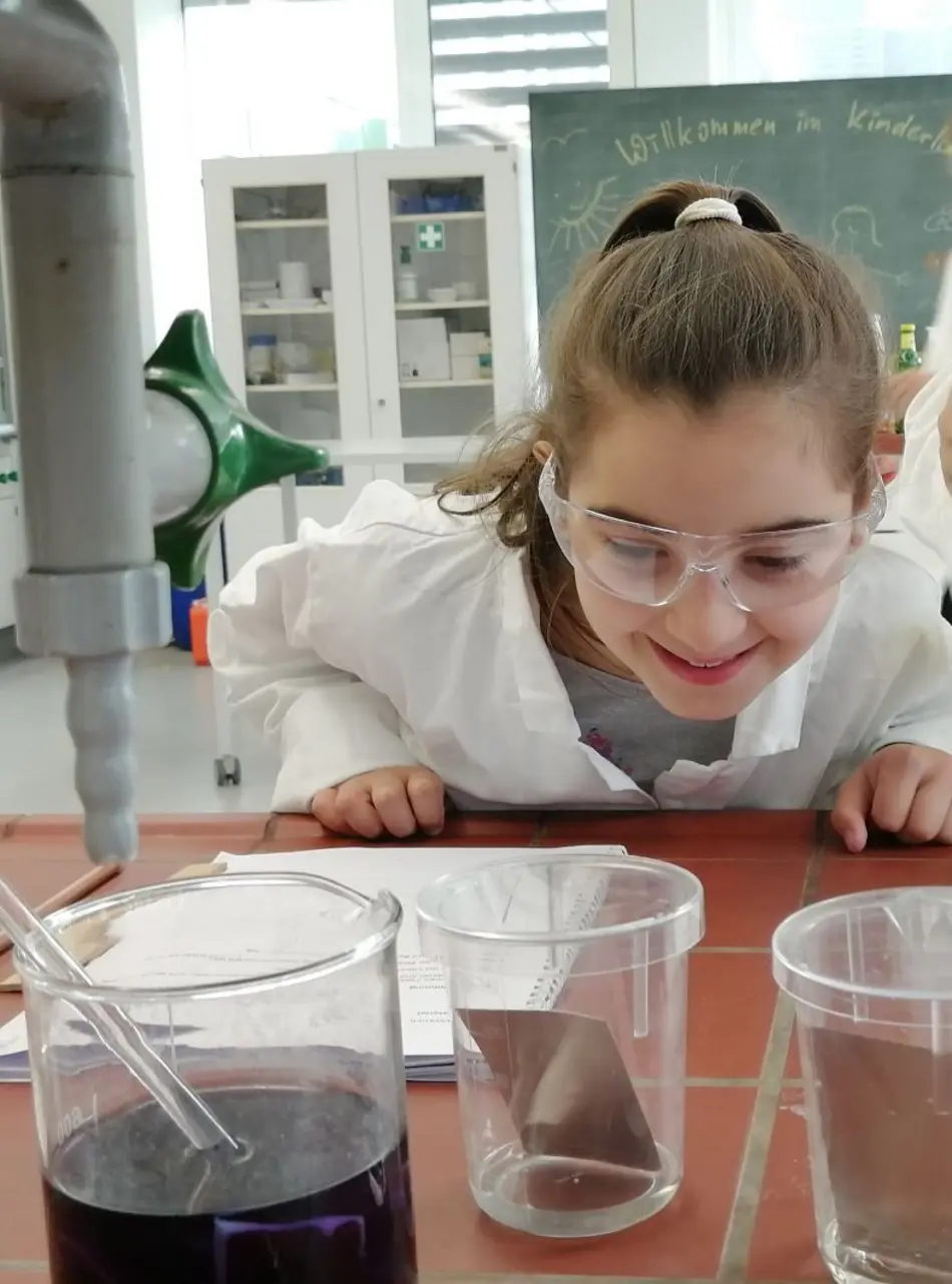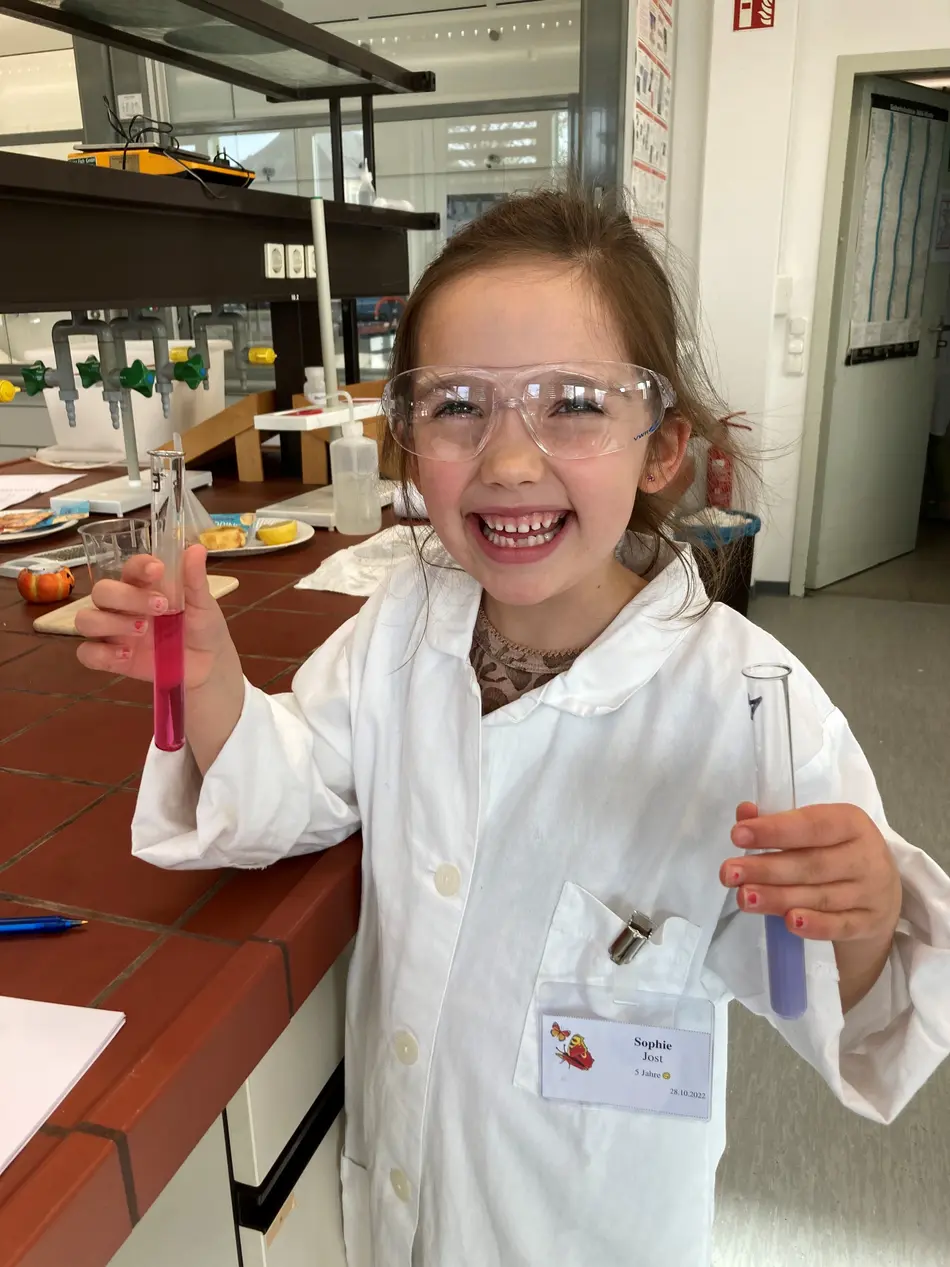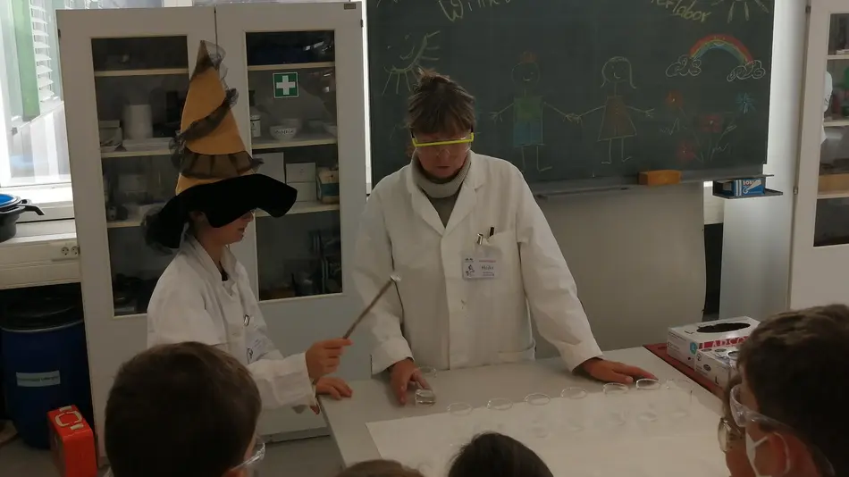 Mit Versuchen rund um Lebensmittel und Haushalt konnten die Kinder in die spannende Welt der Chemie eintauchen. Und es wurde auch gezaubert! Dazu überließ Frau Prof. Dr. Raddatz dem Wissenschaftlernachwuchs ihren Zauberstab zur Durchführung der wundersamen Reaktionen.