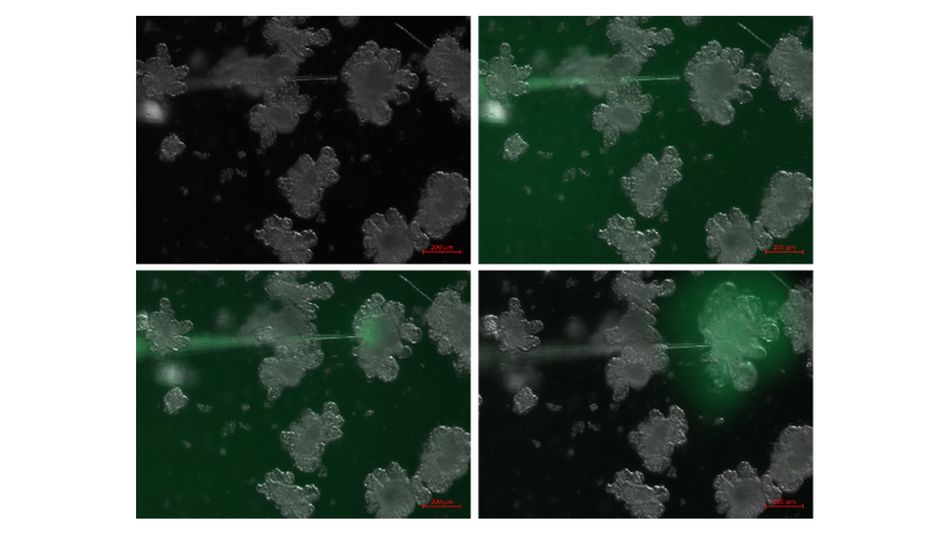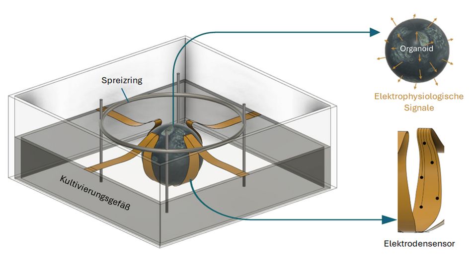 Mit einem neu entwickelten 3D-Sensorsystem entstehen hochkomplexe biologisch-technologische Schnittstellen, die es erlauben, die elektrophysiologischen Signale von komplexen kugelähnlichen Organoiden zu verfolgen und zu analysieren.