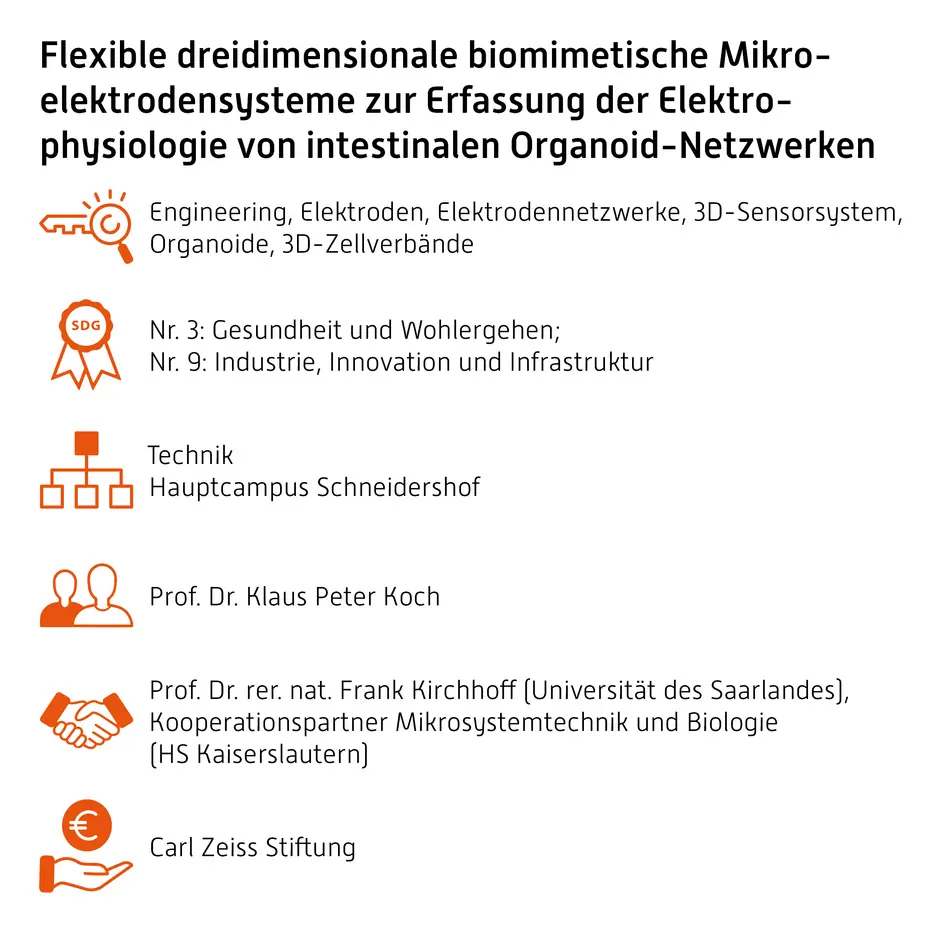 Im Rahmen des interdisziplinären Forschungsprojektes Komplexe dreidimensionale biomimetische Sensor- und Organoid-Netzwerke zur Erhebung funktioneller Daten der Darmbarriere (OriDarmi), gefördert durch die Carl-Zeiss-Stiftung, werden Methoden zur Untersuchung der physiologischen Vorgänge in darmwandähnlichen Zellverbänden entwickelt, um den Einfluss von Medikamenten, Nahrungsbestandteilen, Mikroorganismen oder krankheitsauslösenden Substanzen auf den Darm besser zu verstehen.
