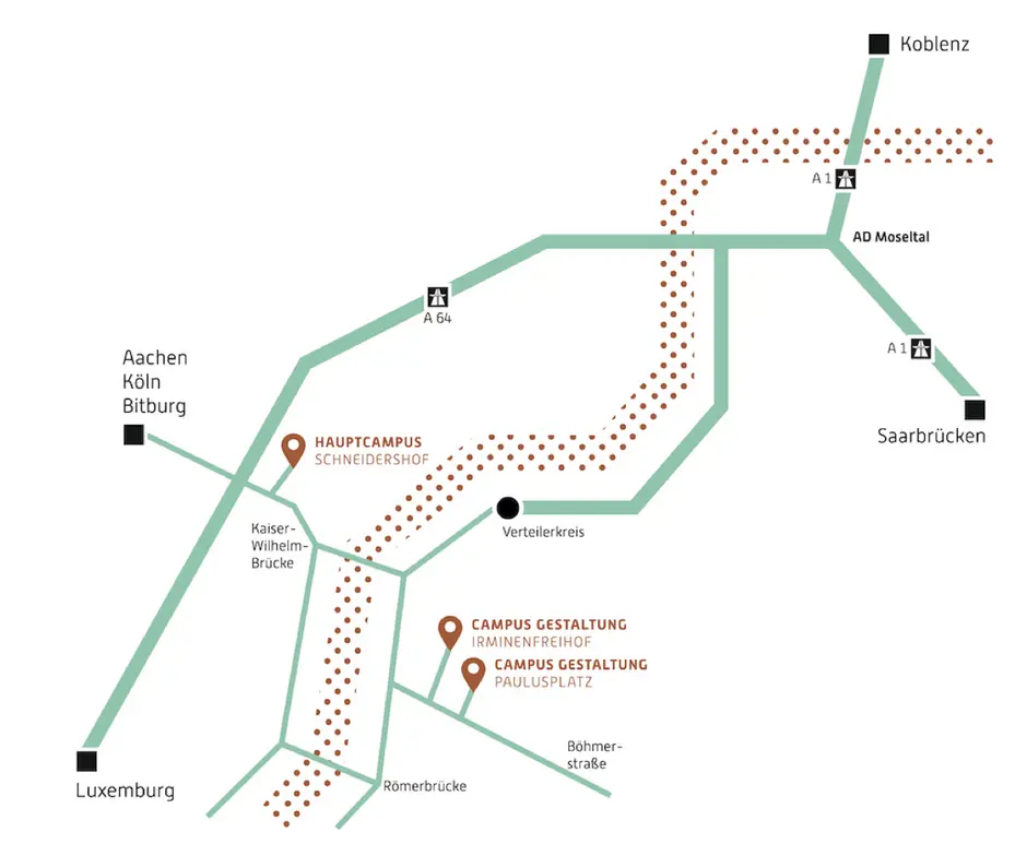 Diese beiden Standorte liegen nahe der Innenstadt. Aus Richtung Koblenz/Saarbrücken kommend, fahren Sie am Autobahndreieck Moseltal von der A1/48 auf die A602 Richtung Trier/Luxemburg. An der Anschlussstelle Trier-Verteilerkreis fahren Sie geradeaus in Richtung Luxemburg (B49). Sie fahren vorbei an der Kaiser-Wilhelm-Brücke und biegen die 2. Straße links in die Böhmerstraße ein. Zum Irminenfreihof nehmen Sie nun die erste Straße links, zum Paulusplatz fahren Sie bis zur nächsten Kreuzung und biegen nach links in die Langstraße ein.