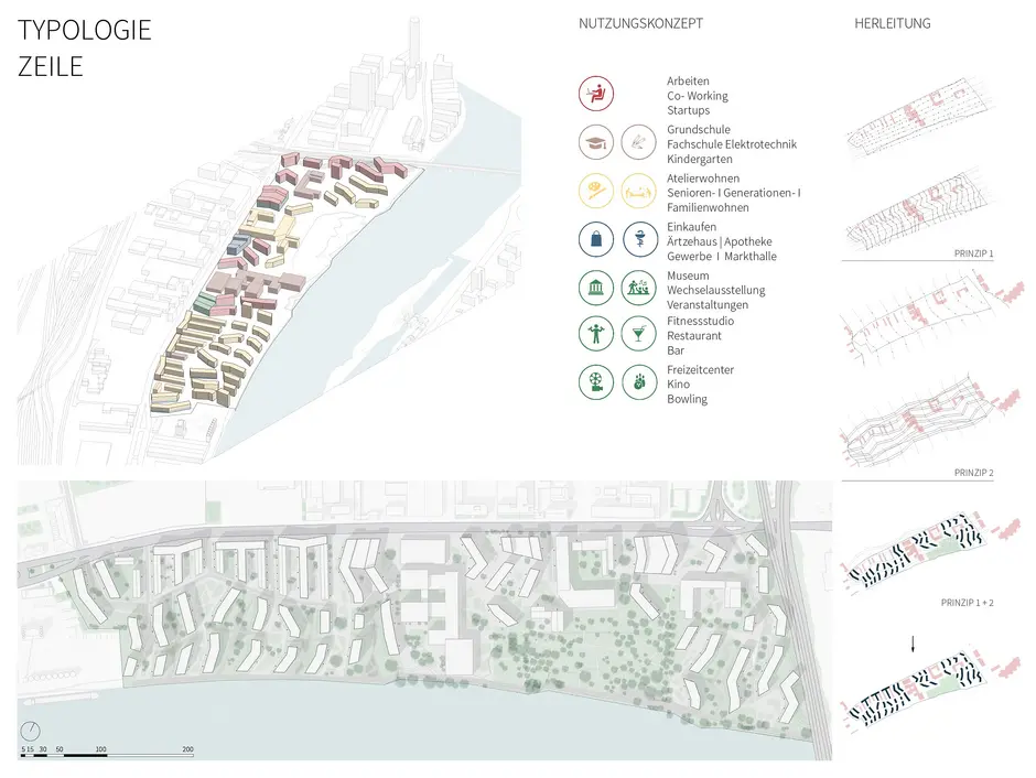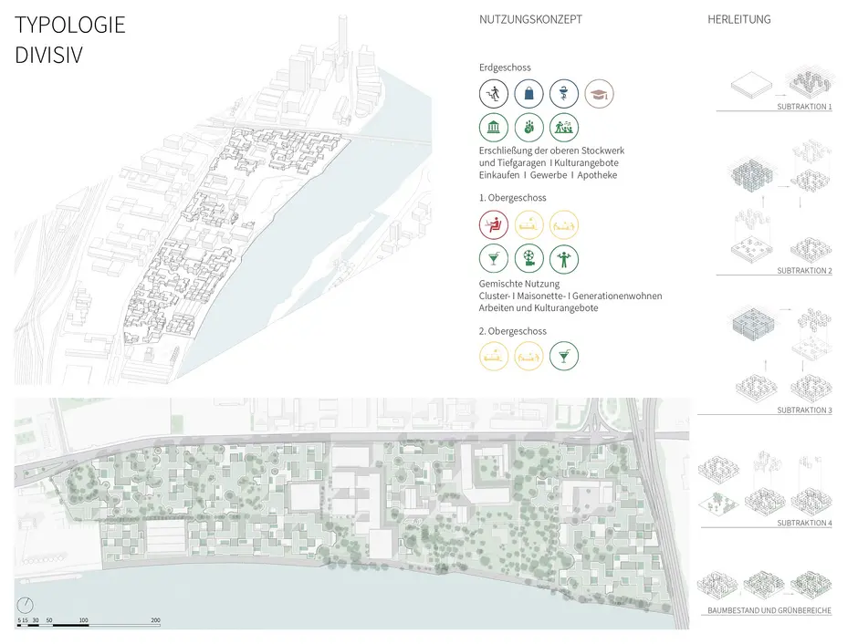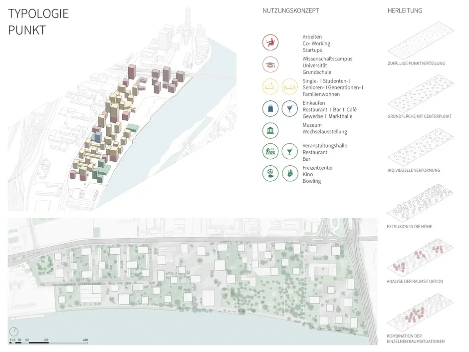 Zur Entwicklung der städtebaulichen Typologien wurden die Programme Rhinoceros 3D und Grasshopper verwendet, mit deren Hilfe parametrische Entwürfe generiert werden konnten. Anhand dieser experimentellen Herangehensweise wurden besondere und komplexe Resultate erzielt.