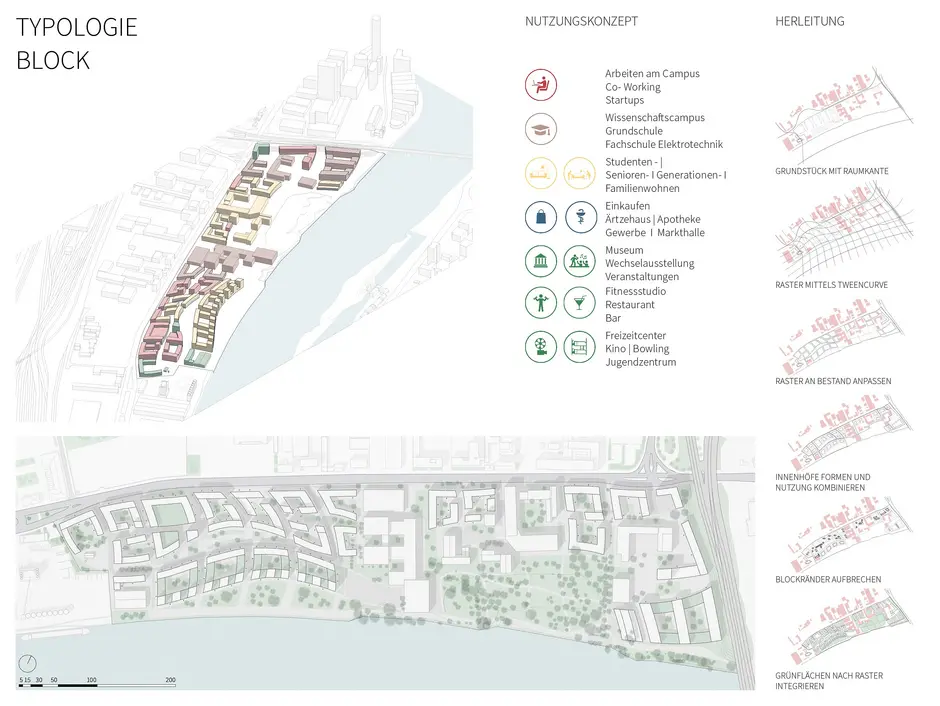 Das Modul „Städtebauliches Entwerfen“ ist ein wichtiger Bestandteil des Studiums. Man lernt den Kontext zu analysieren, ortsspezifische Besonderheiten herauszufiltern und dies in Kartierungen deutlich darzustellen und darauf bezogen verschiedene bauliche Strategien auf ein Areal anzuwenden. Es wird deutlich, wie komplex Städtebau gedacht werden muss und dass es schwierig ist, in einer Typologie ein solch großes Grundstück zu bespielen, ohne das Bild des Viertels zu monoton zu gestalten. Die Landschafts- und Freiflächenplanung kann die ausgearbeiteten Konzepte wesentlich unterstützen und nimmt somit eine wichtige Rolle in der städtebaulichen Planung ein.