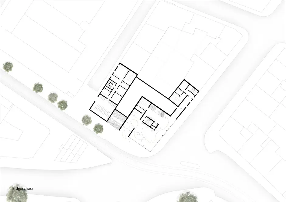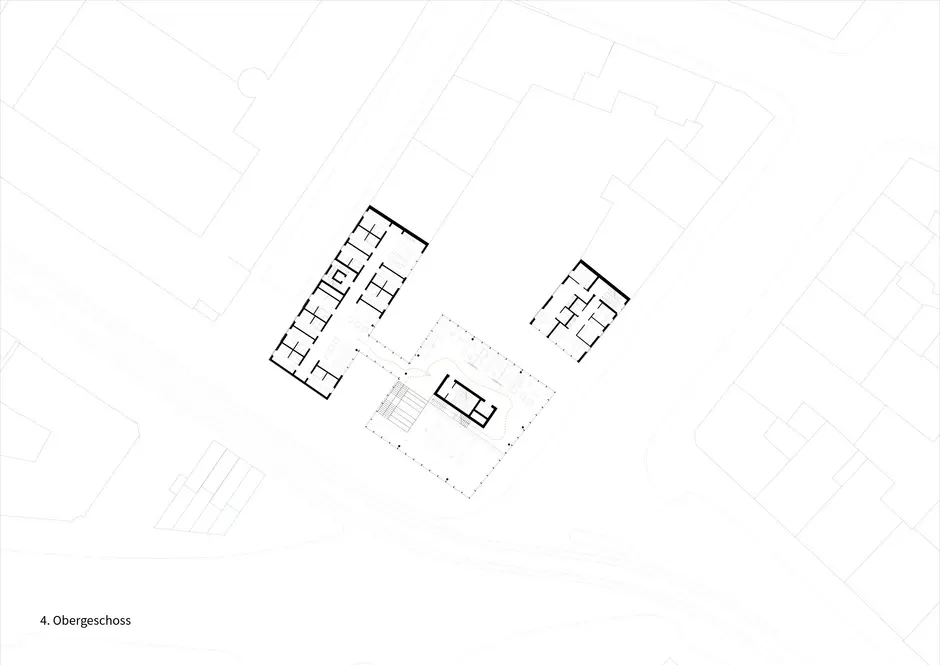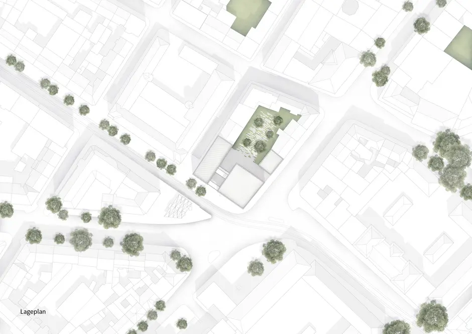 Das Ensemble verfügt über enge Verbindungen mit den benachbarten Gebäuden des Blockrandes. Die Wohngebäude werden durch eine Zeile im Westen und eine Punktbebauung im Osten in den den Fluchten weitergeführt. Durch die ankommenden Fluchten des städtischen Kontexts wird eine neue Begrenzung des Blockrandes generiert, die weiter in die Verkehrsachse des Platzes ragt und ihn damit stärker abschließt an dessen nördlicher Seite. In diese neue Ecksituation stellt sich repräsentativ ein Solitär. Die einzelnen Gebäude werden von einem Sockelgeschoss verbunden, durch welches sich lediglich der Solitär bis auf die Straßenebene durchsteckt. Da der Kubus die vorwiegend öffentlichen Nutzungen beherbergt, wird somit eine einladende Geste gegenüber dem Fußgänger erreicht. Die angrenzenden Gebäude des Ensembles beginnen in ihrer Hauptnutzung erst über dem Sockel. Dies schafft eine Schwelle zur Öffentlichkeit. Damit die Trennung zwischen Öffentlich und Privat nicht als harter Schnitt erfolgt, verfügt der Sockel über eine großzügige Treppe, die der Erschließung der Wohngebäude und der inneren Grünfläche dient. Die Gemeinschaft des Kollegs mit der Stadtgesellschaft wird die Sockelstruktur konzentriert auf den Solitär und verstärkt seine Position.