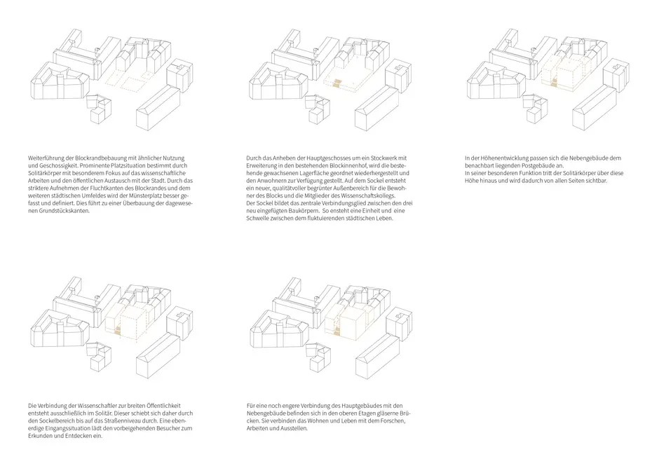 Städtebaulich fällt dem Gebäude die Aufgabe zu, den Münsterplatz, der aktuell durch die mangelnde Gebäudehöhe am Blo- ckende undefiniert ausläuft, stärker und klarer zu begrenzen. Gesellschaftlich hat das Institut die Aufgabe, moderne Wissen- schaft der breiten Öffentlichkeit näher zu bringen und erfahrbar zu machen. Für die Nutzer des Kollegs soll ein Ort entstehen, der intensiv das gemeinschaftliche Wohnen, Arbeiten und Forschen fördert.