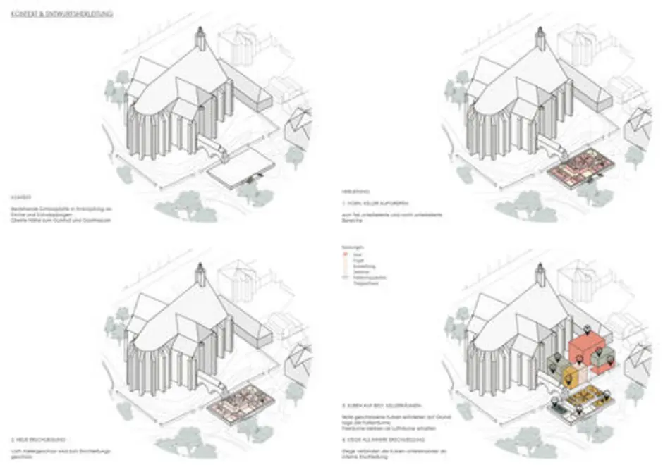 Das Konzept des Gebäudes beruht auf dem Grundriss des vorhandenen Kellers und dreht sich um dessen Zugänglichkeit und Erfahrbarkeit. Unterkellerte Bereiche wurden dabei in ihrer Form und Größe aufgenommen und in die darüberliegenden Geschosse projiziert. Nicht unterkellerte Bereiche dienen dabei als Luftraum und sind auch in die höher liegenden Geschosse durchgesteckt.