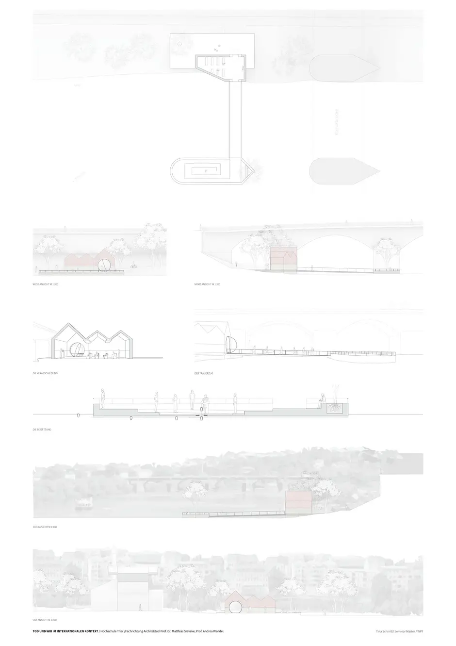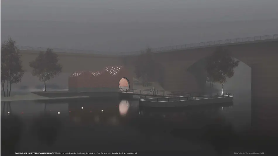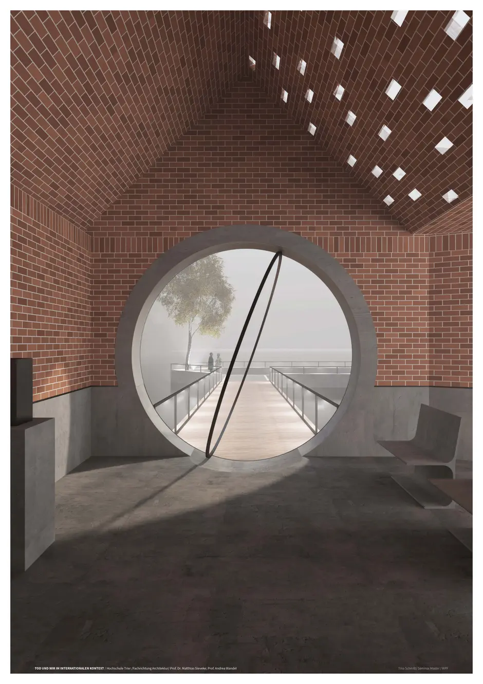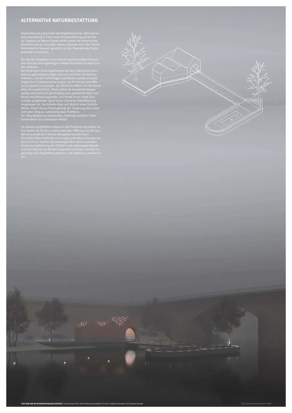 Die Idee scheint paradox. Der Entwurf will einen der, wie es heißt, „leblosesten Orte“ der Stadt Trier durch eine naturnahe Begräbnisstelle vitalisieren. Und gleichzeitig das verdrängte Thema Tod ins alltägliche Bewusstsein rücken. Dazu noch den Kontext betonen. Geplant ist der Alternativfriedhof an einer evokativen Stelle am Ufer der Mosel. Die historische Römerbrücke liegt oberhalb. In eine Kapelle aus gebranntem Ziegel fällt nordseitig das Licht durch einzelne Glasbausteine in der Dachfläche. Durch eine gläserne, schwarz eingefasste, sinnfällig kreisrunde Drehtür führt der Weg auf einen Holzbohlensteg hin zu einer Plattform, die spiralförmig zur Beisetzungsstelle hin abgetreppt ist. Der Kreis hinter einem schließt sich, die Urne wird dem Fluss übergeben. Die Darstellung des Entwurfs im schummrigen Licht weckt Venedig-Assoziationen. Schon auch pathetisch. Aber warum auch nicht.