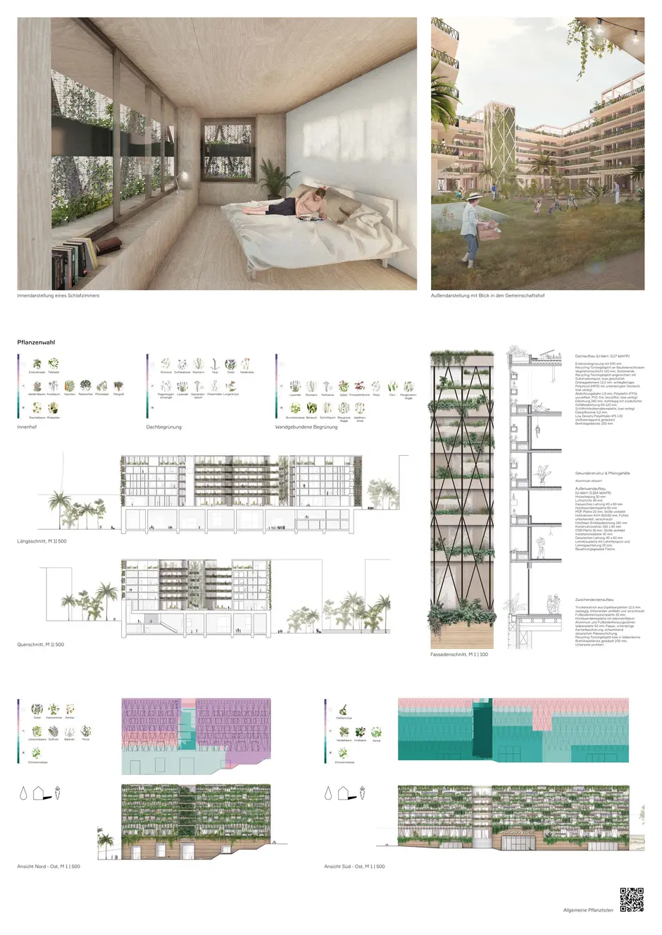 Ein Gebäude, das grünt. Im Entwurf der Studierenden, einem mehrgeschossigen Wohnungsbau in Holzbauweise für den Madrider Stadtteil Las Tablas, wuchern Pflanzen konstruktiv. Als gestaltendes Element, Verschattungsvehikel, Feinstaubfilter, Lärmminderer, Wasserspeicher, Kühlung, natürliches Upgrade der menschlichen Daseinsbedingungen unter anderem im zur kollektiven Nutzung konzipierten Garten. Auch Insekten dürften sich in dem bebauten Areal zuhause fühlen. Der Planprozess für diesen Prototyp gleicht einer fachübergreifenden Studie über den zielgenauen Einsatz des Floralen im Architektonischen, bei der etwa Standortfaktoren und Klimaklassifikationen korreliert wurden. Am Ende steht ein Leitfaden für Planende mit den entsprechenden Parametern und einer Pflanzliste für die verschiedenen Gebäudesituationen. Mit einem QR-Code ist er exemplarisch und digital einzusehen. Eine Studienarbeit als fundierte Inspiration.