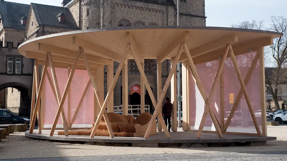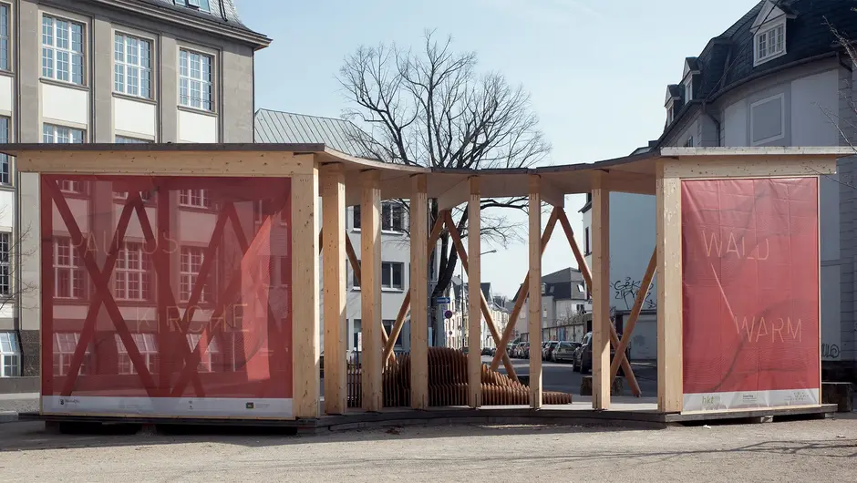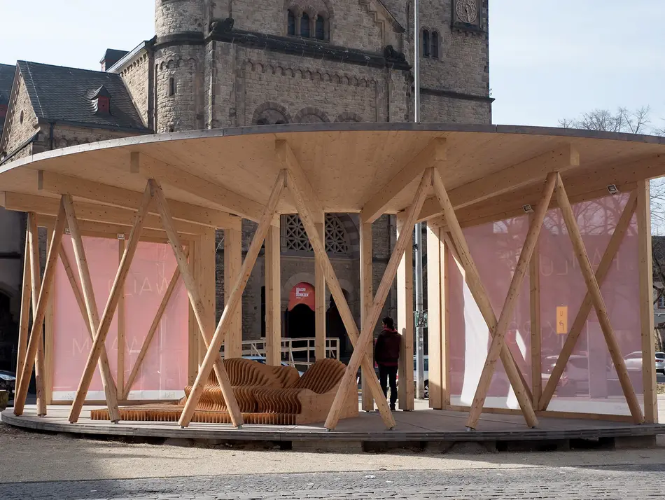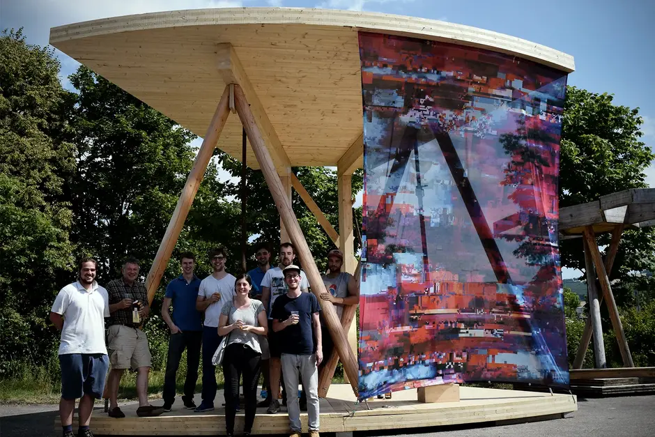 Für den bislang wenig attraktiven Vorplatz des Hochschulgebäudes Paulusplatz am Campus Gestaltung Trier wurde eine überdachte Freifläche geschaen, welche die Idee des historischen „Reißbodens“ oder „Schnürbodens“ mit Mitteln moderner parametrischer Entwurfswerkzeuge der Architektur, sowie CAD/CAM-Werkzeugen des Holzbaus umsetzt. Über mehrere Semester wurde gemeinsam mit Studierenden der Fachrichtung Architektur eine Struktur entworfen, untersucht und optimiert, um diese dann im Herbst 2018 mit Unterstützung regionaler Holzbaufirmen zu errichten. Ein im Vorfeld mit Studierenden errichteter Prototyp brachte wertvolle Erkenntnisse für die endgültige Umsetzung, zusätzlich zu der vielfältigen Erfahrung in der praktischen Anwendung für die Studierenden. Der Pavillon wird bis Mitte 2019 der Ausstellung „Dialog im Dunkeln“ in der Pauluskirche als Außenwerbefläche sowie als Veranstaltung-und Aufenthaltsort dienen.