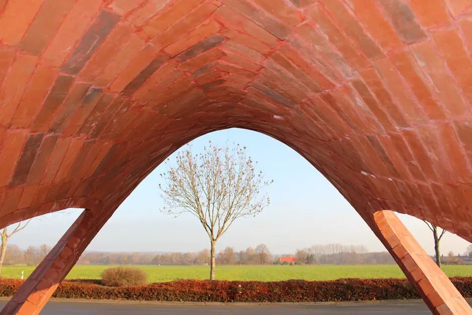 Für den Eingangspavillon sollte auf eine Konstruktion zurückgegriffen werden, bei der eine möglichst dünneZiegel-Schale durch ein innenliegendes Carbontextil verstärkt wird. Dabei soll die Konstruktion eine Materialstärke von insgesamt nicht mehr als 7 Zentimetern aufweisen und von außen als reine Ziegelfläche wahrzunehmen sein. Das Carbontextil sowie der Betonmörtel im Inneren der Konstruktion sollen dabei unter der Ziegelschicht verdeckt bleiben.