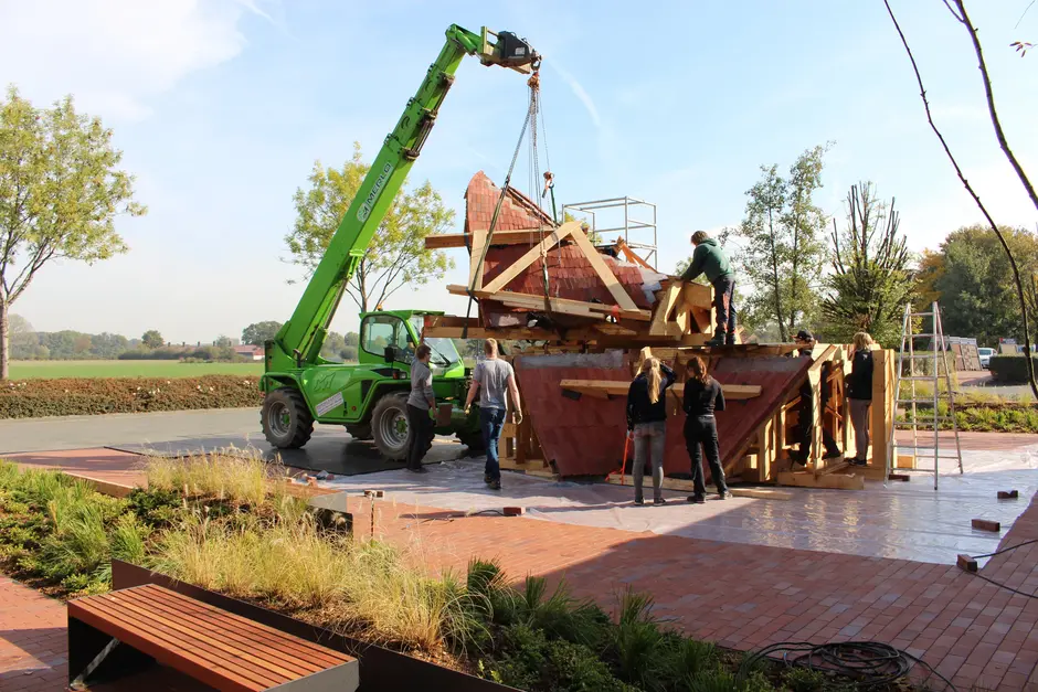 Im Rahmen der Interdisziplinären Projektwoche 2018 war die Gruppe dann vor Ort mit der Installation und Positionierung der einzelnen Elemente auf dem bereits, eigens für die Ziegelschale, fertiggestellten Platz vor dem Klinkerwerk beschäftigt. Nun galt es noch die Nahtbereiche zwischen den einzelnen Fertigteilen zu schließen und den keilförmigen Sockel, der die Schale mit dem vorgefertigten Fundament verbindet, zu modellieren. Nachdem der Ziegelverband und der Betonmörtel ausreichend ausgehärtet waren, konnte in einem weiteren Termin vor Ort das Holzgerüst zunächst um einige Zentimeter abgesenkt und anschließend unter der Schale herausgezogen werden. Zu diesem Termin war der Statiker Prof. Stefan Polónyi eigens angereist.