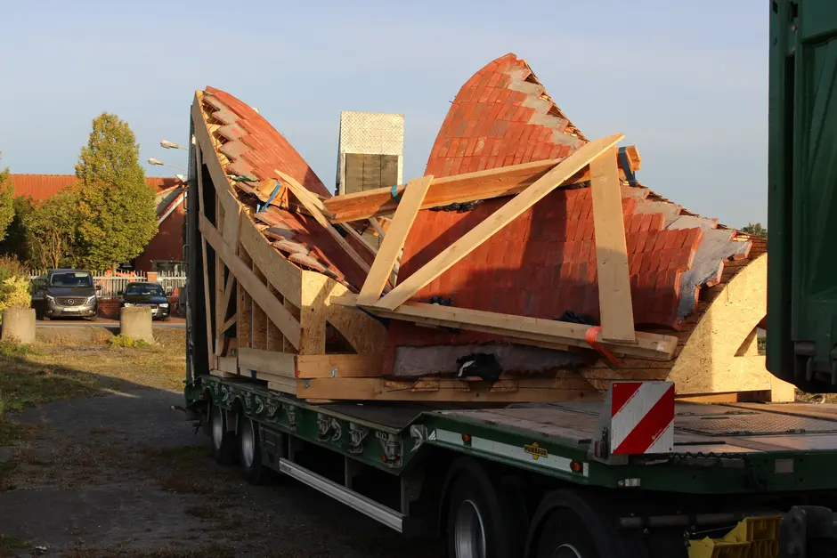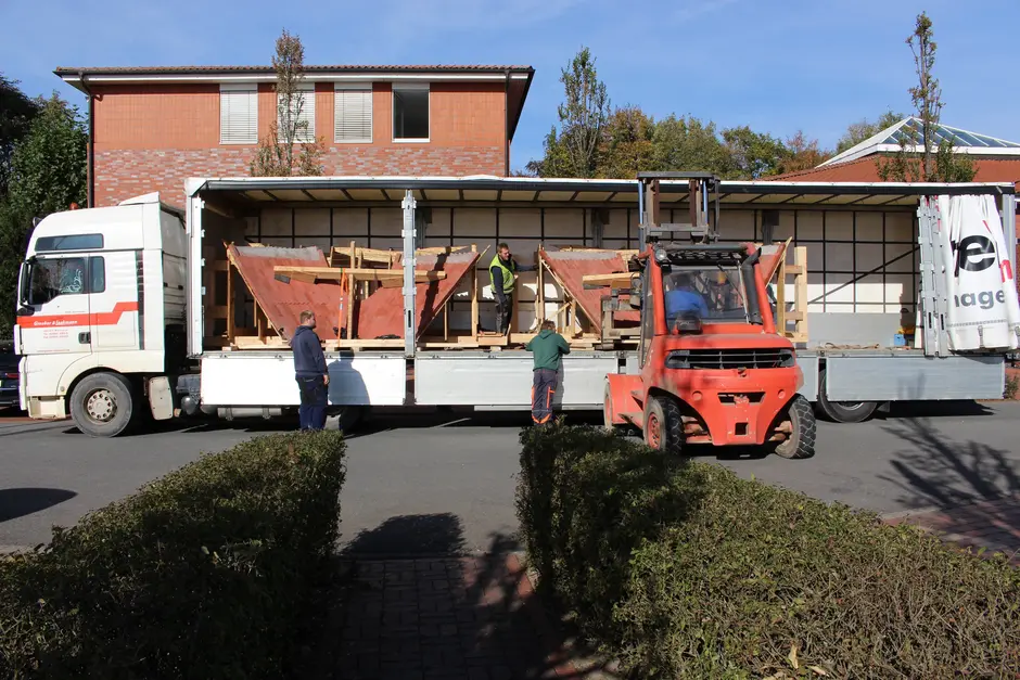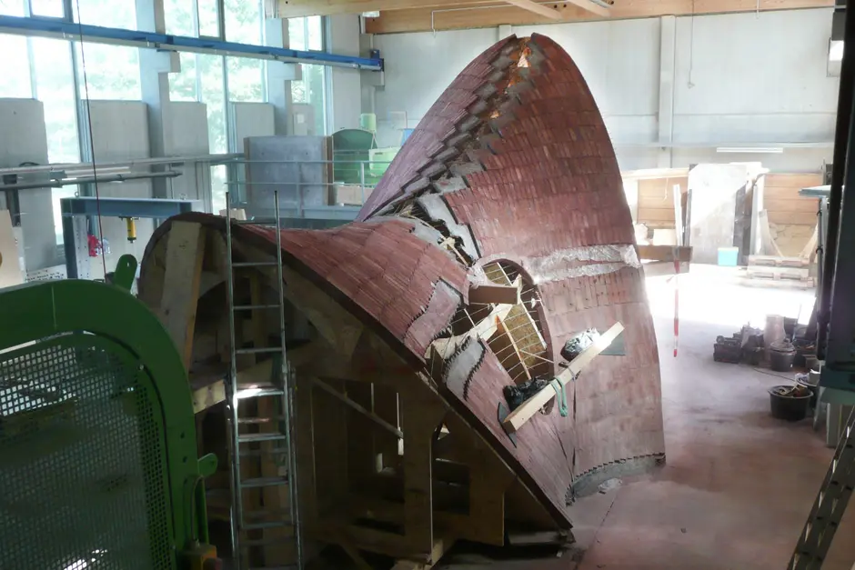 Wir haben beschlossen die Schale aus 5 einzelnen Fertigteilen zu bauen, die in der Größe den Transportmöglichkeiten auf dem LKW angepasst waren. Diese werden mit den entsprechenden Nahtbereichen für den späteren Aufbau und das Vermauern auf dem Gelände des Klinkerwerks vorbereitet. Zum Start des Wintersemesters sind die Arbeiten in Föhren abgeschlossen und die einzelnen Elemente demontiert und für den Transport mit LKWs nach Nottuln auf den Schalunsggerüsten gesichert.