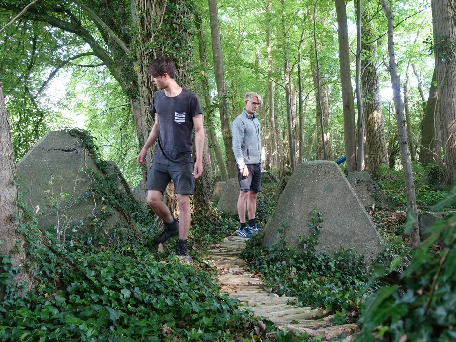 Studierende der Studiengänge Architektur, Intermedia Design und Kommunikationsdesign im Fachbereich Gestaltung der Hochschule Trier haben sich in diesem Sommer während eines 7-tägigen Exkursions-Workshops entlang des 600 km langen militärischen Bauwerkes ‚Westwall’ zwischen Basel und Niederrhein bewegt. Während dieser Zeit haben sie sich Tag und Nacht so nahe wie möglich entlang dieser historischen Linie aufgehalten und sie in ihren charakteristischen Elementen von Bunkern, Gräben und Panzersperren kennen gelernt. Aus der Auseinandersetzung mit der Geschichte des Westwalls und seiner Bedeutung in der heutigen Zeit sind vor Ort künstlerische Projekte und Interventionen entstanden, in denen die Studierenden einen eigenen Standpunkt entwickeln und ihre Spuren hinterlassen. Diese Projekte sind Inhalt der Ausstellung.