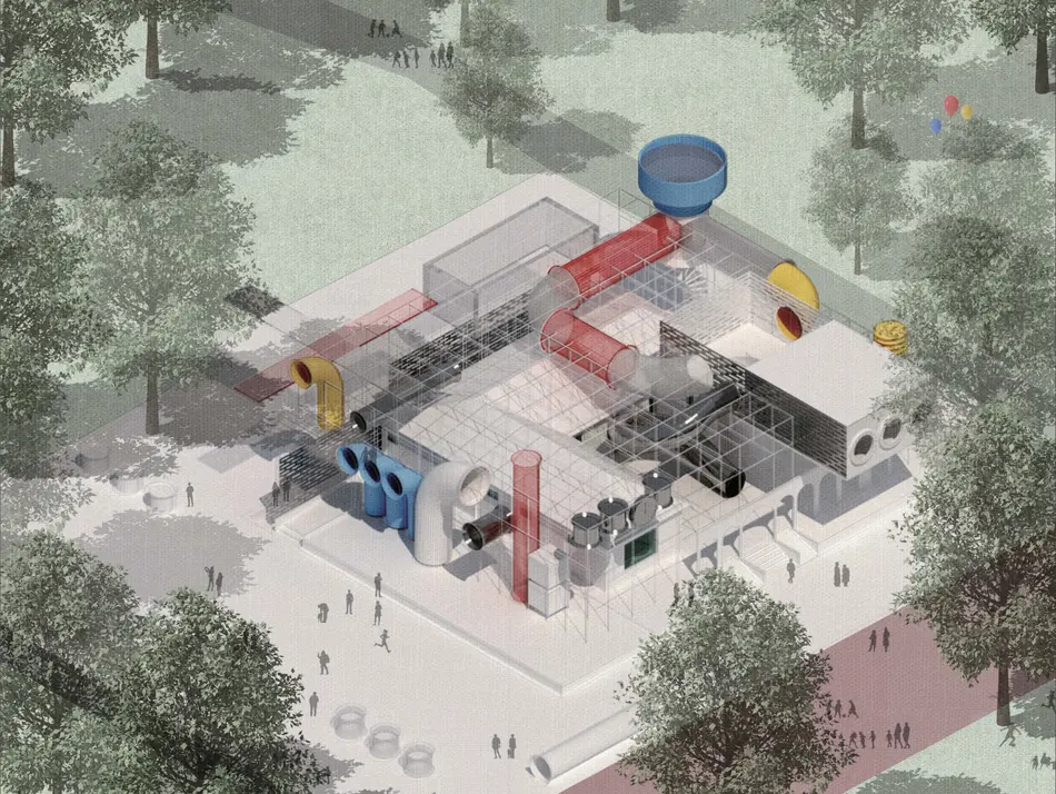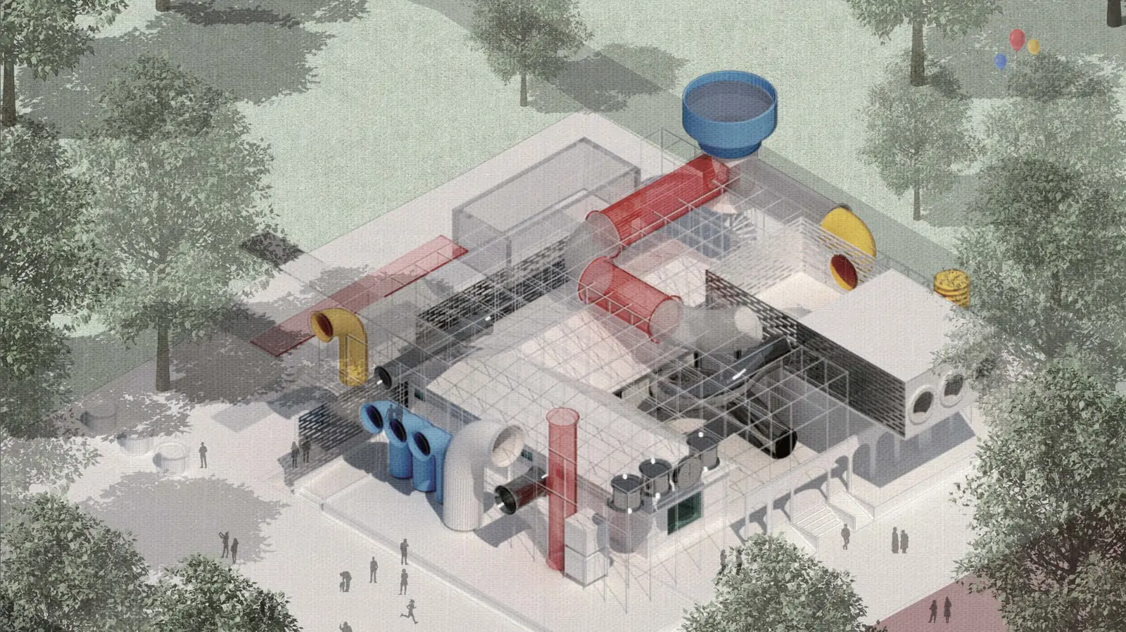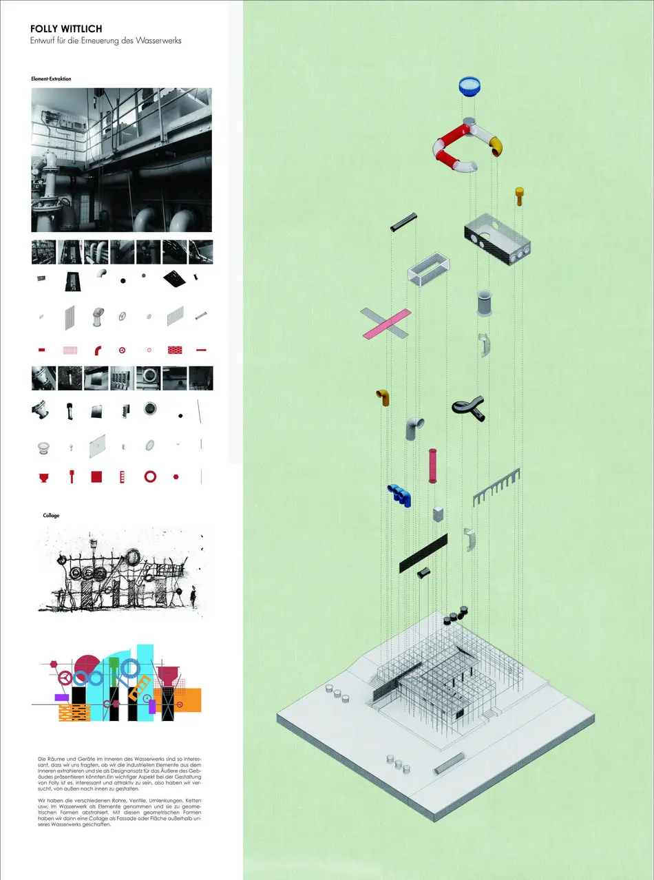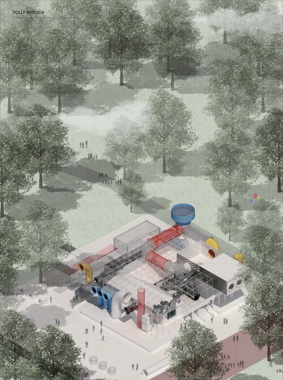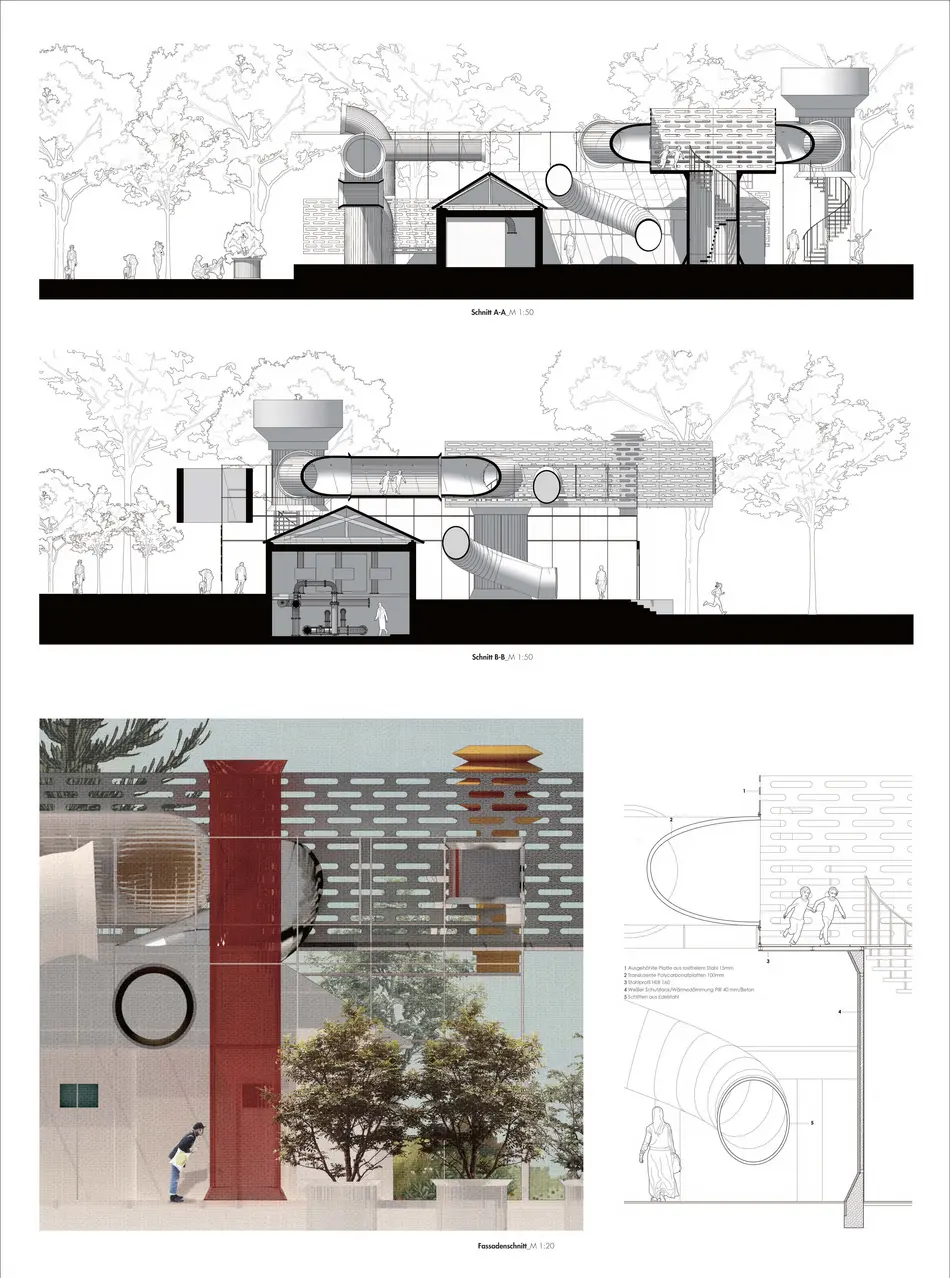 Die mit dem 1. Preis (1.500 Euro) ausgezeichnete Arbeit der Studierenden Hang Lyu, Ying Wu und ZiXuan Lu, überzeugte in hohem Maße durch den bis ins Letzte durchgearbeiteten konzeptionellen Ansatz, bei dem Elemente der im Gebäude befindlichen Armaturen spielerisch adaptiert, skaliert und künstlerisch frei collagiert bzw. arrangiert wurden. Die das Bestandsgebäude umhüllende Struktur wird so auf zahlreiche Weisen erfahr- und erlebbar, begehbar und sogar spielerisch zu erklettern.