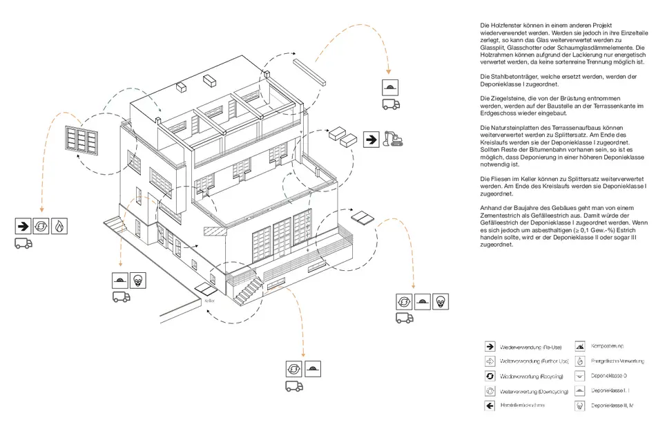 Diese Semesterarbeit analysiert die energetische und recyclingfähige Sanierung der Villa Winternitz, die von Adolf Loos 1932 im Prager Stadtteil Smíchov, Tschechien, geplant wurde. Das Gebäude repräsentiert die charakteristische Architektur von Loos im 20. Jahrhundert, Villa Winternitz wird auch häufig als die kleine Schwester der „Villa Müller“ bezeichnet. Loos prägte als Vorreiter der modernen Architektur eine klare kubische Formensprache, eine reduzierte Fassadengestaltung und eine verschachtelte, hochwertige Innenraumgestaltung. Sein „Raumplan“ verdeutlicht seinen innovativen Ansatz der Raumkonzeption. Die Villa besteht aus einem Massivbau aus Mauerwerk in Kombination mit Stahlbeton-Elementen und reflektiert damit die Bautechnik und konstruktiven Möglichkeiten der 1930er Jahre. Das grundlegende Konzept der Villa überdauert bis heute durch Zukunftsfähigkeit und Innovation, jedoch entspricht die Materialwahl - besonders bei den Material Fügungen - nicht mehr den energetischen und ökologischen Standards. Das neue Sanierungskonzept bewahrt die charakteristische äußere Erscheinung und die Proportionen des Bestands. Es integriert ressourcenschonende Materialien, rückbaufähige Konstruktionsmethoden und Strategien zur nachhaltigen Energiegewinnung. Diese Maßnahmen schützen und pflegen den kulturellen und historischen Wert der Villa Winternitz zukunftsorientiert und machen einen Neubau überflüssig.