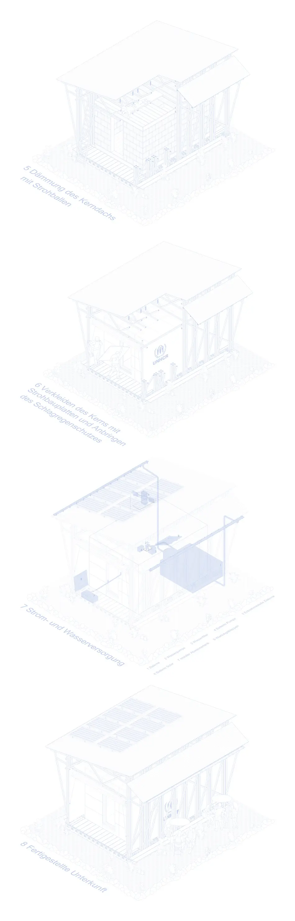 Die Hauptmaterialien sind Holz und Stroh. Stroh als landwirtschaftlich nur teilweise verwendeter Pflanzenteil unterschiedlicher Nahrungspflanzen ist global verfügbar, an fast jedem Standort gut beschaffen und mit einer einjährigen Umtriebszeit rasch nachwachsend. Für den notwendigen trockenen Aufbau des Strohs wird zuerst die Außenhülle aus 6x6 cm Holzprofilen aufgebaut und dann der innere, thermisch isolierte Strohkern. Die kleinen Holzprofile sind handlich und, genau wie die Bretter im Dach der Strohbox, kostengünstigeres Schnittholz. Das Fundamentraster bilden ausrangierte Getränkekästen, die auf einem Kieswall eben ausgelegt werden können. Zur Beschwerung und zur Aufnahme der Feuchtigkeit werden diese mit den vor Ort vorhandenen Sandsäcken gefüllt. Der Zeltboden der Flüchtlingszelte eignet sich als Abdichtungsfolie gegen aufsteigende Feuchtigkeit im Boden. Die verwendeten Cola-Kisten haben relativ kleine Flaschenfächer, die die Stützenprofile aufnehmen. Mithilfe von Abstandshaltern zwischen den Holzprofilen ist eine Anpassung an jede Kastengröße möglich. Die Außenhülle besteht aus einem doppelten, mit einem Wellblech aus gepressten Tetra Paks gedeckte Pultdach, das als eine Art Kaltdach eine gute Belüftung des thermisch getrennten Strohkerns sicherstellt. Das Dach und der Boden des Strohkerns werden mit einfachen Strohballen ausgefacht, während die Außenwand aus Holzständerboxen besteht, in die Stroh gepresst wird. Diese Boxen können gut von einer Person getragen werden. Verlegt und miteinander verschraubt werden sie im Mauerverbund, sodass keine Kreuzfugen entstehen und dennoch immer lastableitende Ständer übereinanderliegen. Das Stroh wird mittels eines einfachen Werkzeugs, einer Box aus Siebträgerplatten gepresst, an deren Hebel man die Druckplatte austauscht, sodass sie entweder zwei halbe, eine ganze Holzständerbox oder einen Ballen pressen kann. Außen und innen wird die Strohbox mit Strohbauplatten im Nut und Feder-System verkleidet. Auch die Möbel werden aus Lignin-gebundenen und daher kompostierbaren Strohplatten gefertigt. Die Bauteilfugen an Fenstern und Türen werden mit Flachs ausgestopft. Im Sanitär- und Küchenbereich sind Platten aus gepresstem Plastikmüll verbaut, um die Strohbauplatten vor Feuchtigkeit zu schützen. Als Schlagregenschutz wird die Außenhülle gebrauchter Flüchtlingszelte verwendet, die an den Eingängen mit einer Art Flaschenzug aufziehbar ist. Für diesen konnten die Ösen, Seile und Stangen der alten Zelte verwendet werden. Die Batterien der PV-Anlage sind im Dachraum untergebracht und versorgen das Haus mit 3,2 kWh und einem Speicher von etwa 3,84 kWh. Durch die Komposttoilette fällt kein Schwarzwasser an, und eine 4.000-Liter-Zisterne versorgt Dusche sowie Waschbecken mit aufbereitetem Regenwasser.