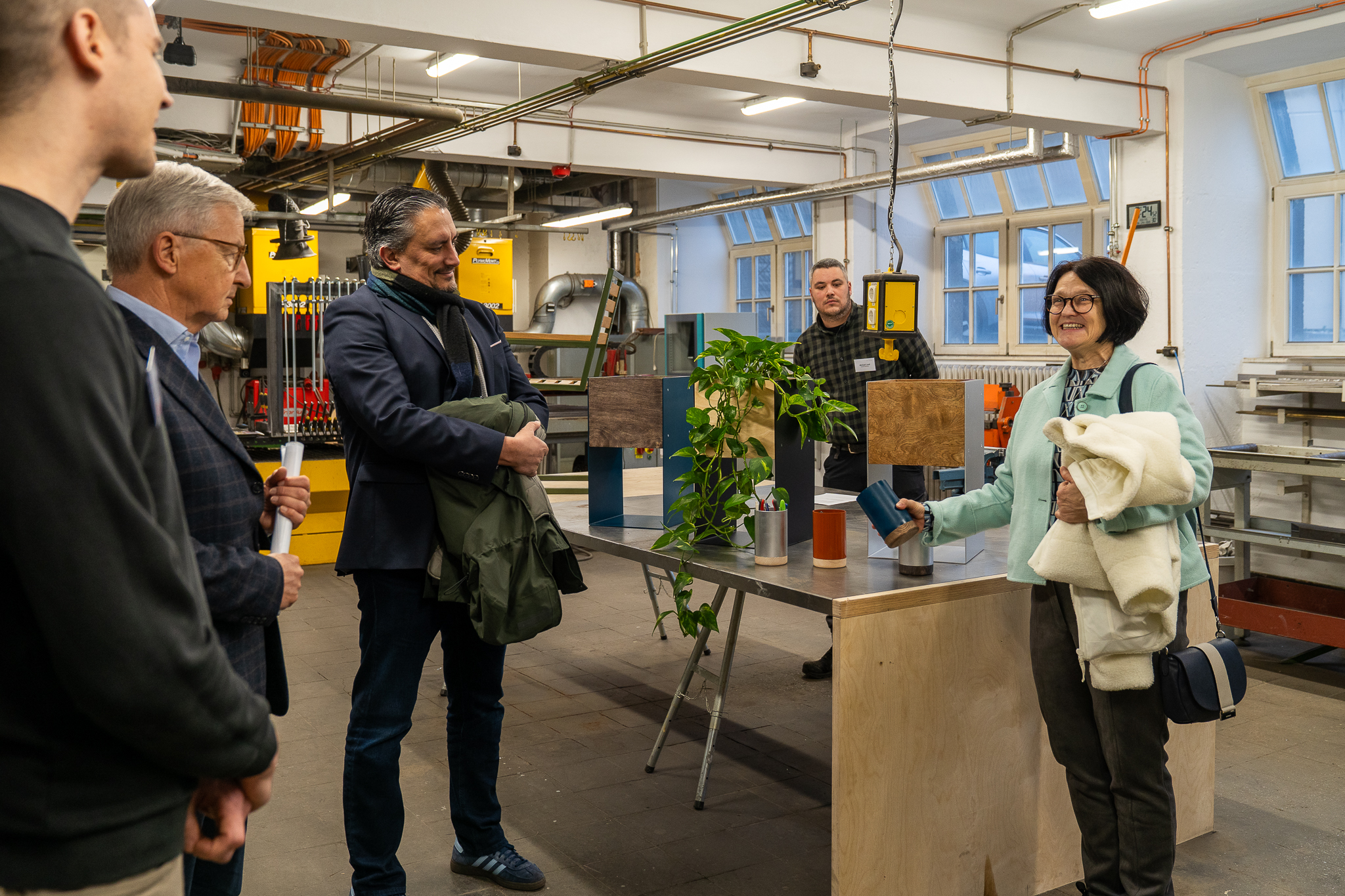 Im Studiengang Innenarchitektur wurde der Ausbau und die Digitalisierung der Werkstätten am Paulusplatz vorgestellt. Prof. Marcus Kaiser betonte „moderne, praxisnahe Lernumgebungen sind eine zentrale Voraussetzung für die gestalterische Ausbildung.“ In der Schreinerei geleitet von Herrn Thorsten Plönzke und der Metallwerkstatt betreut von Herrn Michael Land arbeiten Studierende an Möbeln, Prototypen und räumlichen Konzepten – von der digitalen Konstruktion bis zur CNC-Fertigung. Durch die Förderung konnten die Arbeitsplätze erweitert und modernisiert sowie an die wachsende Zahl der Studierenden angepasst werden. Damit leistet die Stiftung einen wichtigen Beitrag zur Sicherung der Ausbildungsqualität und zur Weiterentwicklung der Lernräume am Campus Gestaltung.