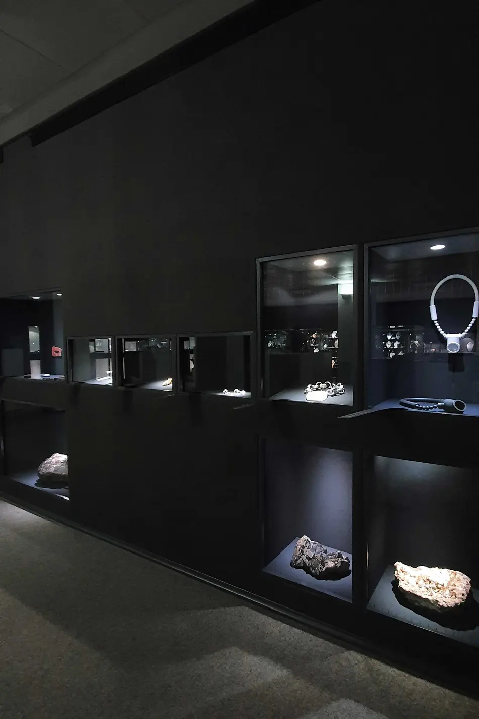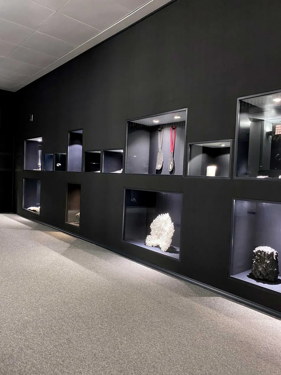 Ausstellungsansicht, Arbeiten von (erste drei Vitrinen von rechts, v.l.n.r.) Catalina Brenes (MFA), Erika Jordan (MFA), Vanessa Zöller (MFA) , Photo: Fa. Robert Schütt Witwe GmbH & Co. KG