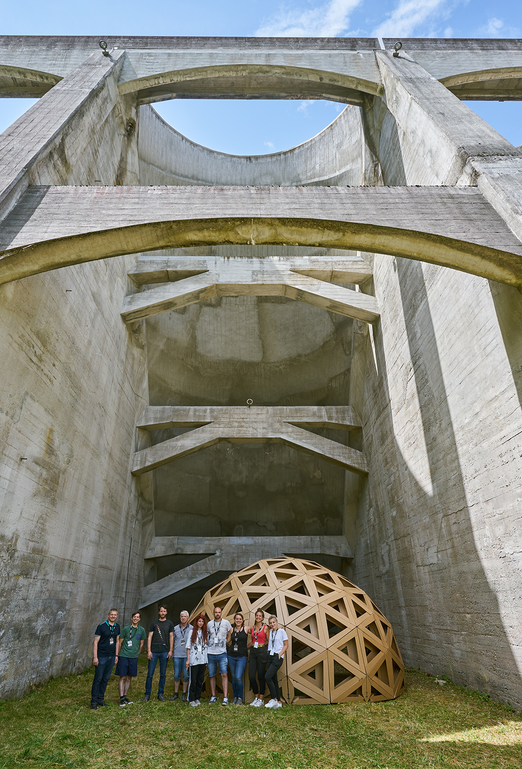 Im Rahmen der Kurse Künstlerisches Gestalten (Prof. Jörg Obergfell) und Konstruieren III (Prof. Martin Schroth) entwarfen Studierende im Sommersemester 2019 geodätische Kuppeln aus Pappe. Mit freundlicher Unterstützung von Brohl Wellpappe wurde eine der Konzeptionen realisiert und am 20. Juli auf dem Reservoir Festival für elektronische Musik an der Linachtalsperre gezeigt. Die 3 m hohe Konstruktion basiert auf dem ikonischen Design Buckminster Fullers. Während des Festivals diente sie als Hülle für eine interaktive Installation von Studierenden der HFU Furtwangen, die sich – aus Anlass des 50. Jahrestags –mit der ersten Mondlandung auseinandergesetzt hatten.
