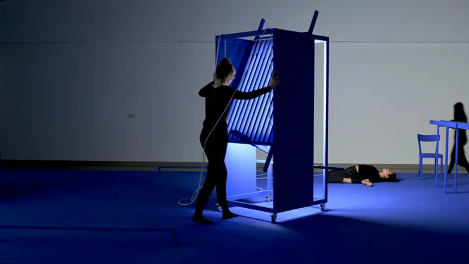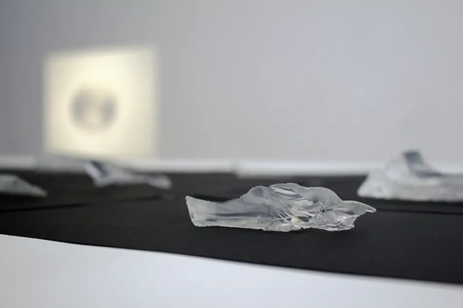 Its transitional, transformative as well as back and forth characters are developed into the works with specific symbolic meanings by certain materials (quartz and steel), relative positions (multiple binary oppositions), color (blue) and so on.
